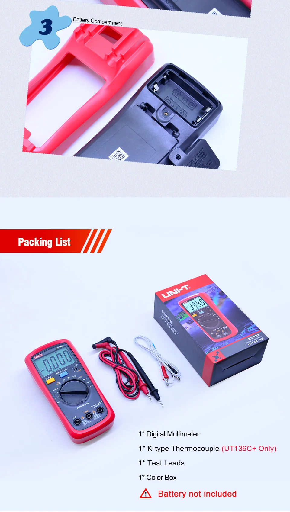 Упаковочный лист:1 * Цифровой мультиметер1 * Тестовый leads1 * Руководство пользователя на английском языке 1 * Температурный Зонд(Только UT16C +)1 * цветная коробкаОбратите внимание: батарея в комплект не входит!