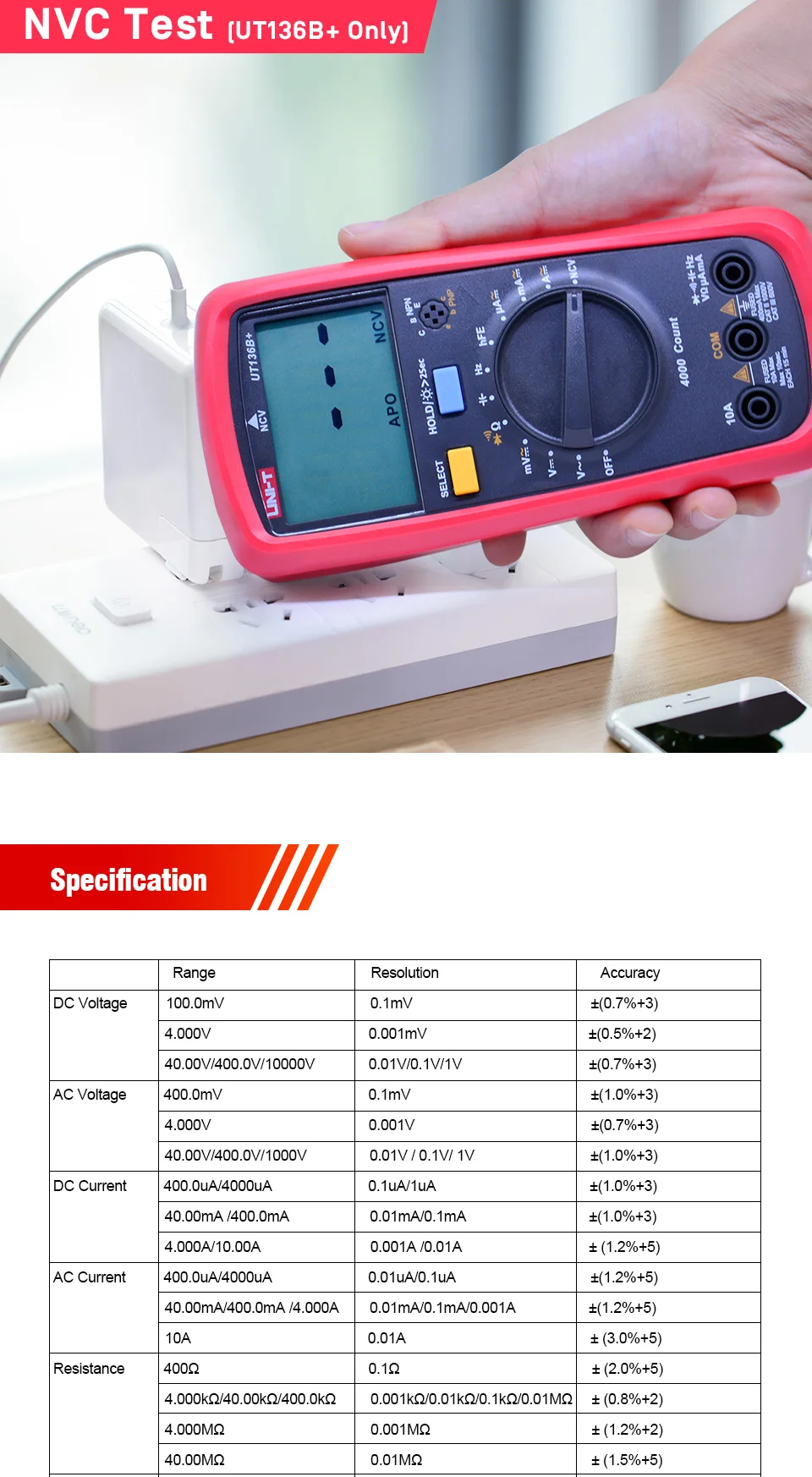Новое поколение цифрового мультиметра серии UT136 + имеет инновационный промышленный дизайн, который гарантирует, что изделие выдерживает падение в 2 метра высоты. Большой ЖК-экран обеспечивает четкий дисплей и его частота выборки 4 раза/секунду обеспечивает пользователям более точные показания. Серия UT136 + предназначена для безопасной работы в среде CAT II1000V/CAT III 600V. Эта серия подходит для гражданского/коммерческого использования, таких как техники ОВКВ и электрики.