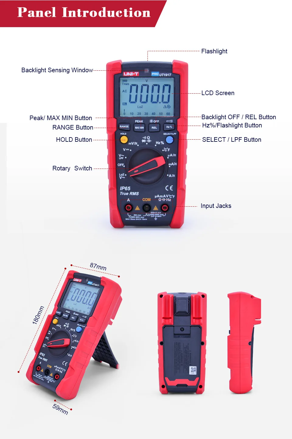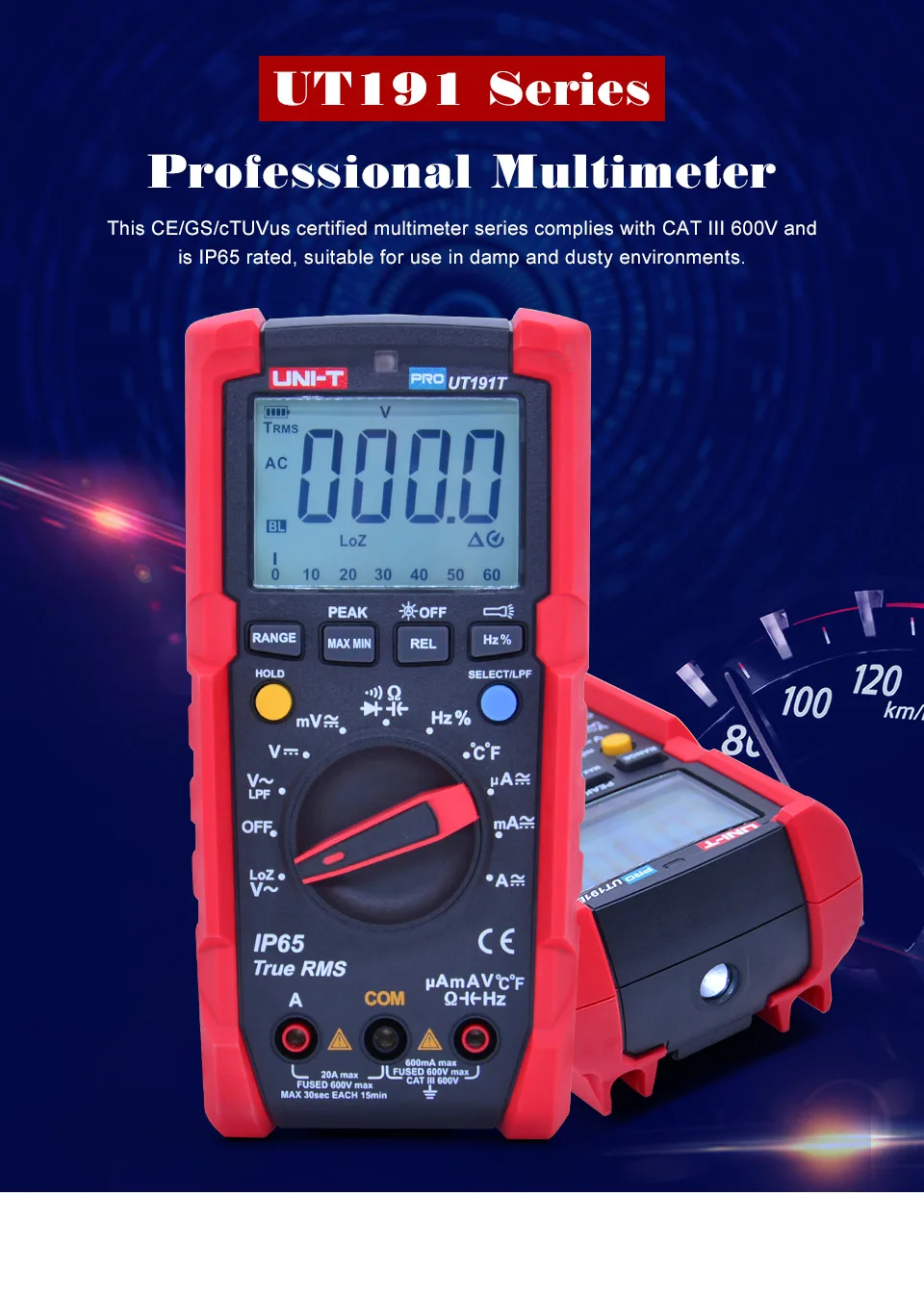 ● Measurement setting saved after power reset ● Precise temperature measurement with resolution of 0.1°( UT191T Only )● Large LCD screen, 6000 display count, sampling rate: 3 times/s ● Error protection for up to 6kV electric shock ● True RMS AC voltage / current and non-linear signal measurement ● Peak value AC voltage / current measurement ● Support measurement of up to 600V / 20A voltage / current ● GS / CE / cTUVus certified. ● Flashlight ; Auto backlight ; Analog bar graph ( 31 sections ) ● Data hold/MAX/MIN / Diode/Continunity test ● IP65, 2m drop test.