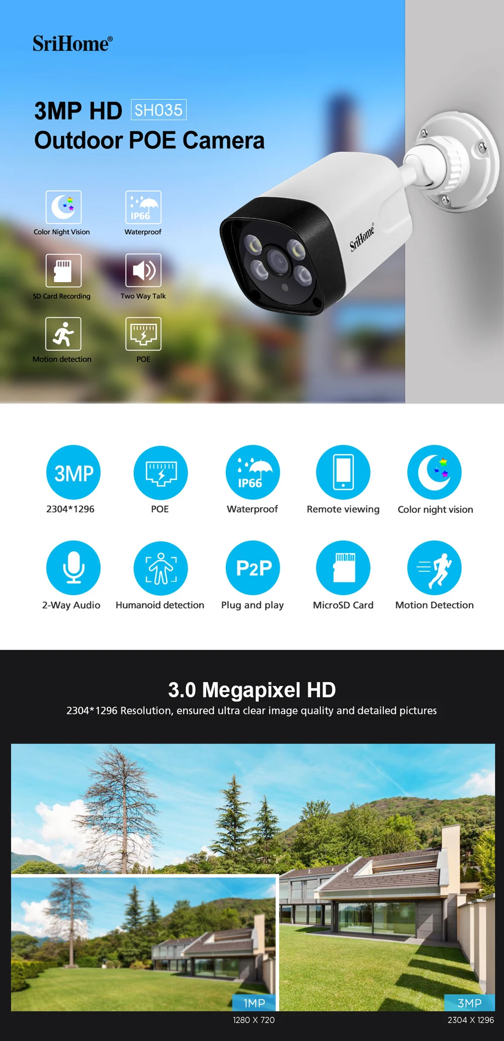 1. FHD: 3MP,1296P(2304*1296), H.264 / H.265