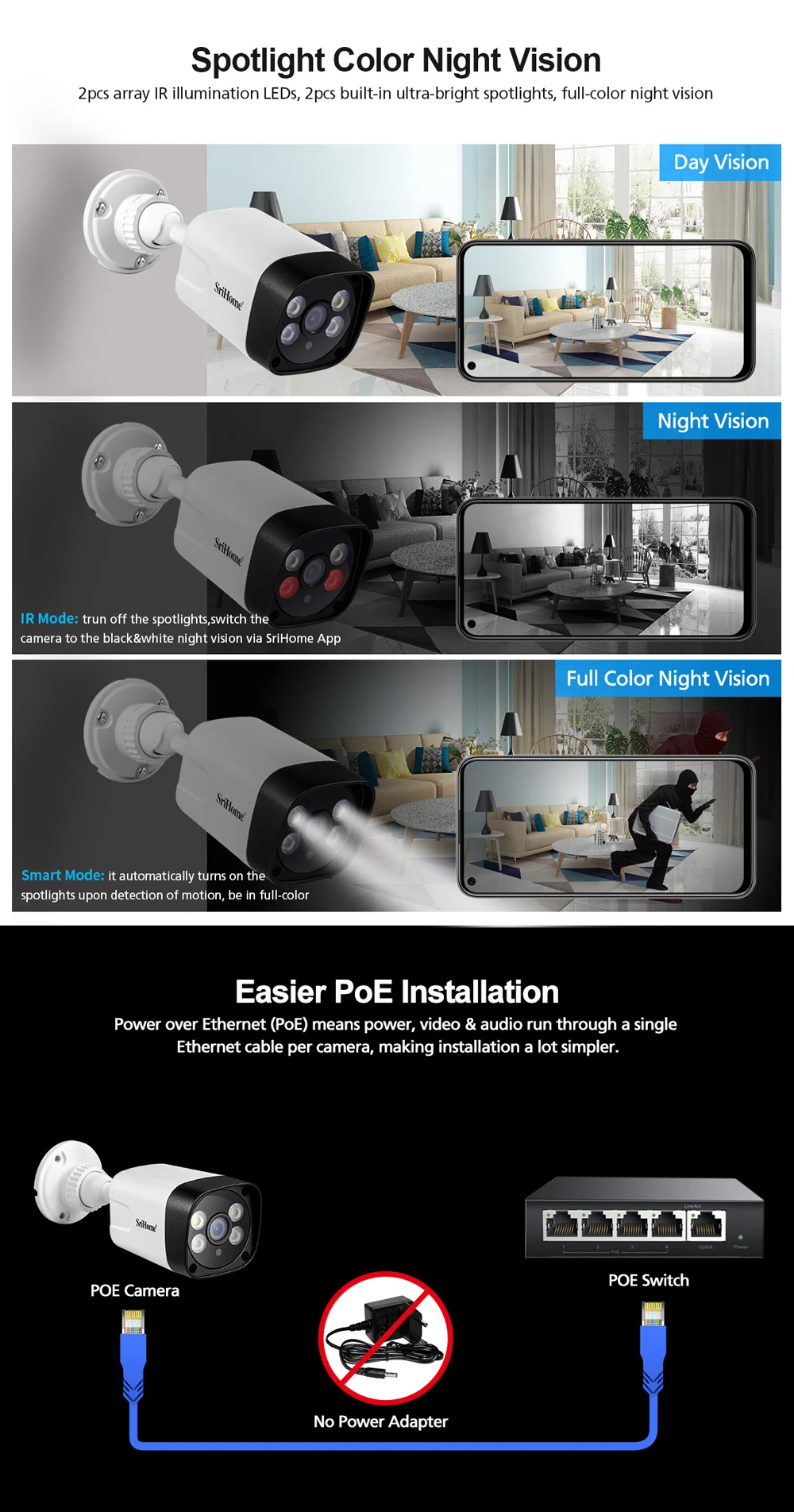 Умный режим: черный и белый ночное видение, он автоматически включается прожекторы upondetection motion, быть в полноцветном