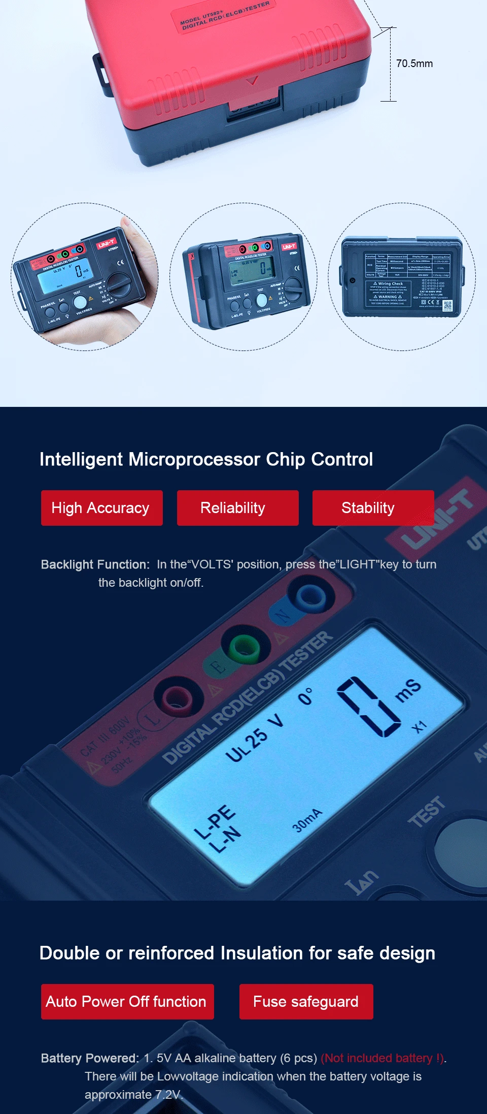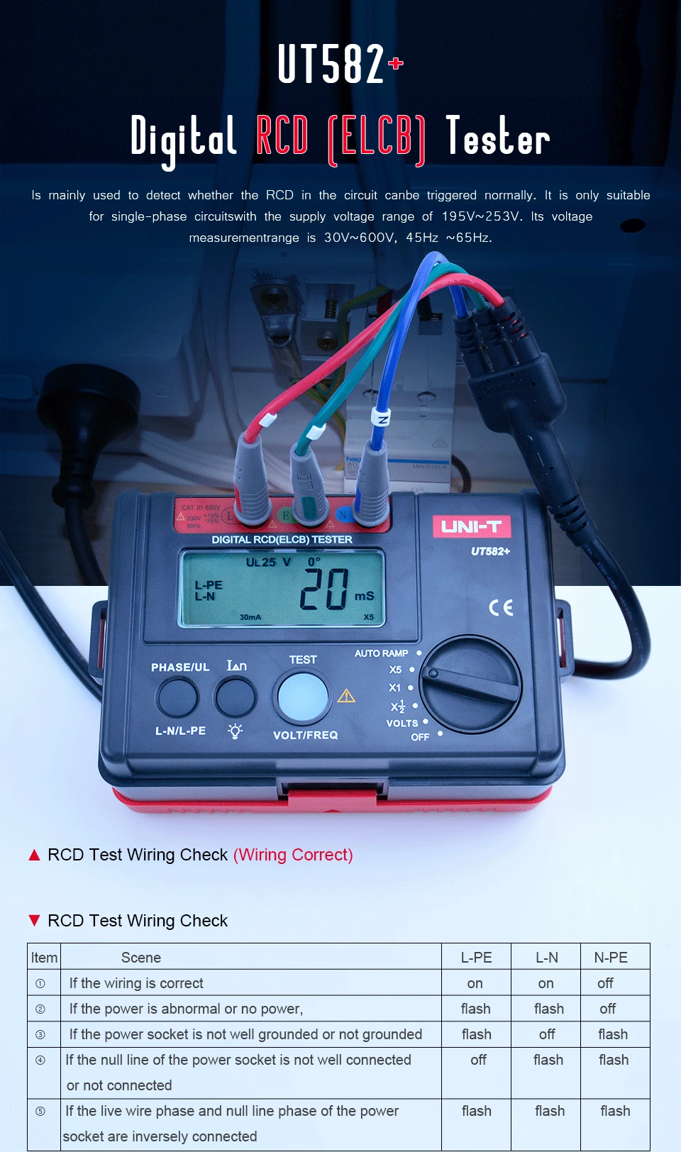 UT582 + в основном используется для определения нормального срабатывания RCD в цепи. Подходит только для однофазных схем с диапазоном напряжения питания 195 в ~ 253 в. Измерение напряжения составляет 30 В ~ 600 В, 45 Гц ~ 65 Гц.