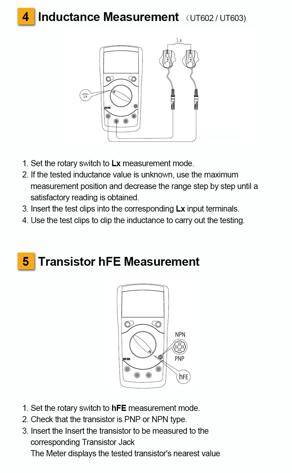 Введение продукта:UT601 Цифровой LCR метр используется для тестирования резисторов, конденсаторов. Он может измерять параметры транзисторов. Измеритель LCR может проверять электронные компоненты в электронных лабораториях, производственных линиях, точках обслуживания и школах.