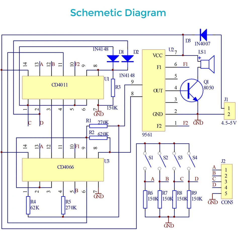 Комбинируйте основную цепь управления и дополнительную цепь управления, составляющую полную схему управления, управляемую A B C D четырьмя бинарными кодировками, 9561 производите 16 различных звуков.