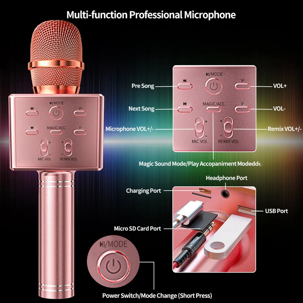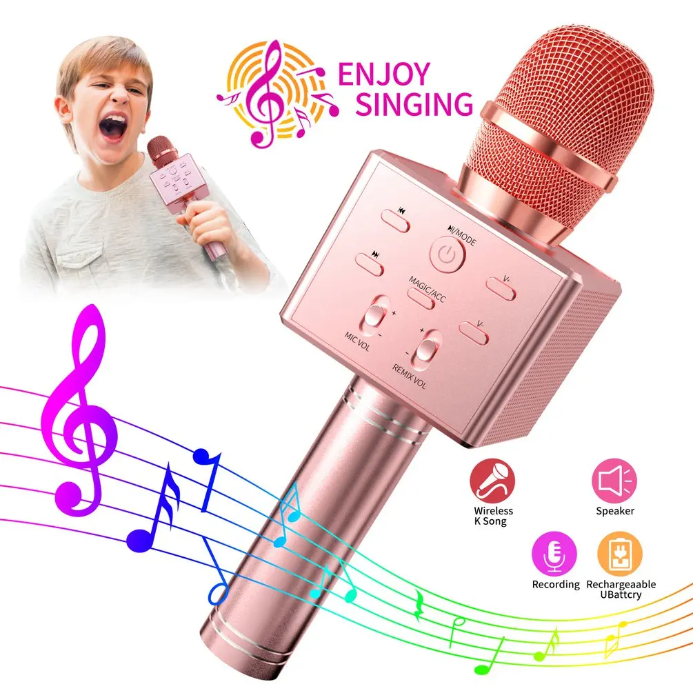 1. Беспроводной микрофон для караоке: этот мини Караоке-микрофон изготовлен из алюминиевого сплава, работает профессионально, прочный и с модным дизайном. Встроенный два внутренних-магнит громкий динамик и 3-х слойные подавление шума: трехслойная сетка фильтр уменьшает шум распространения. С помощью кнопки регулировки громкости и ремикс сама по себе имеет более громкий и чувствительный выход.