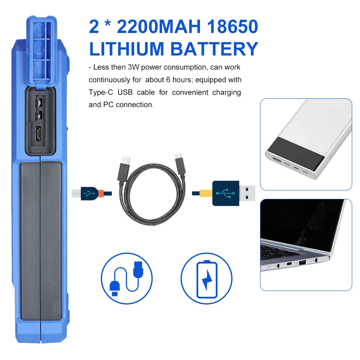 [2*2200 мАч 18650 литиевая батарея] менее 3 Вт Потребляемая мощность, может работать непрерывно около 6 часов; Оснащен usb-кабелем Type-C для удобной зарядки и подключения к ПК.