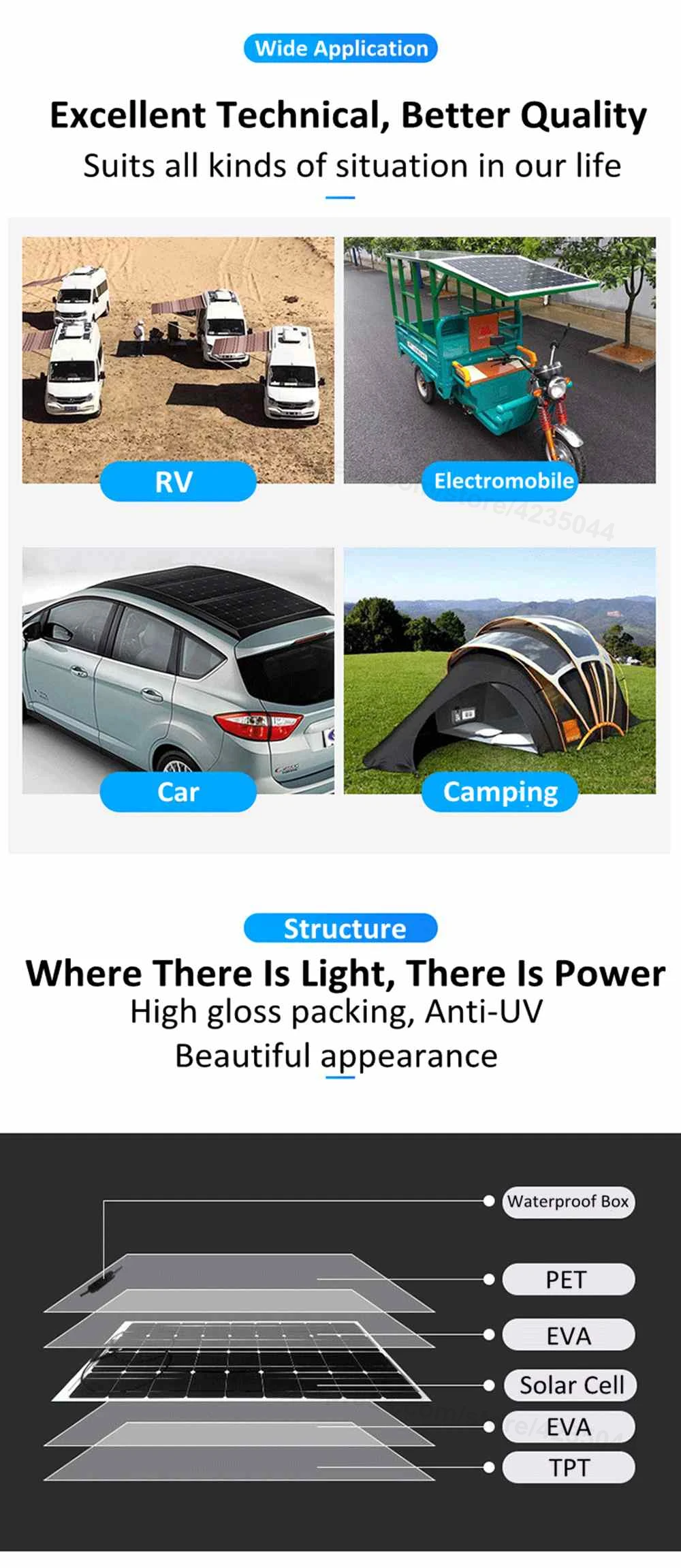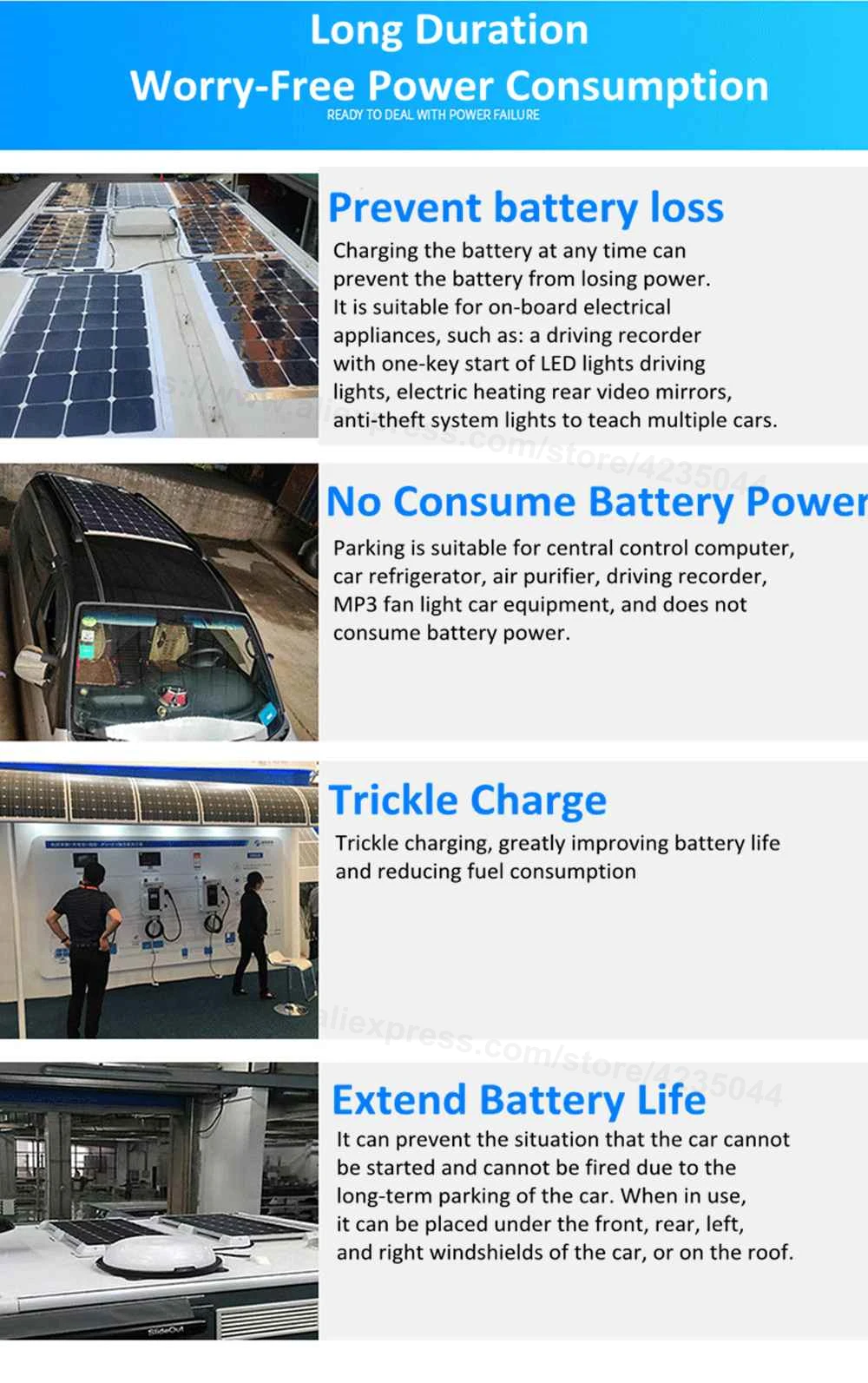 Подходит для большинства свинцово-кислотных батарей или другого оборудования на рынке.Может согнуться на 30 градусов и установить в RVs, рыбацкие лодки, деревянные дома, палатки или любые другие наружные сцены. Этот метод питания является энергосберегающим и экологически чистым, подходит для работы на открытом воздухе, путешествий или кемпинга. Дизайн для активного отдыха,Хорошая производительность в водонепроницаемости или термостойкости.