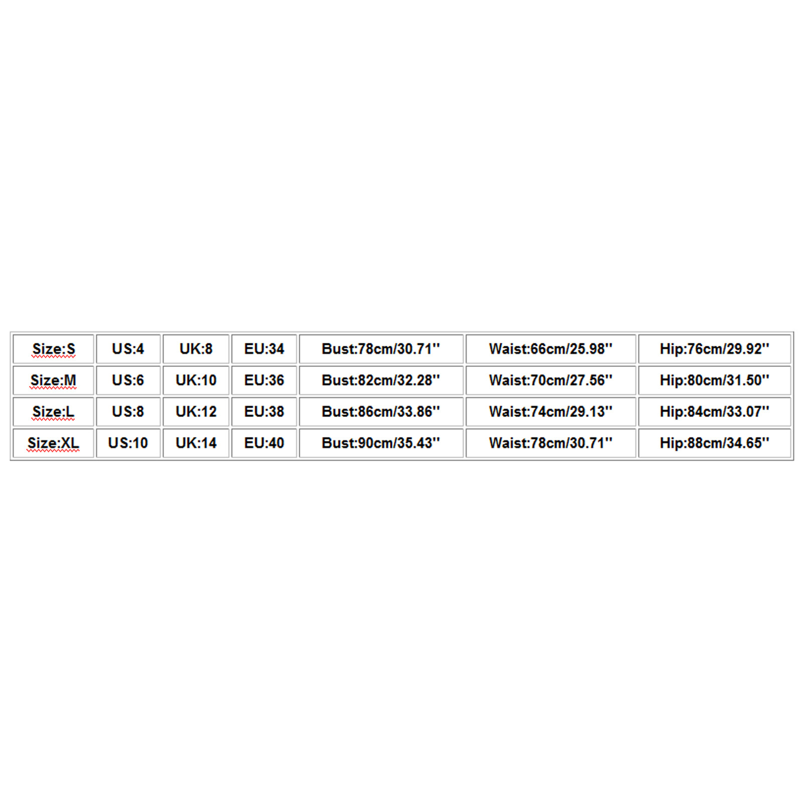 Размер США Великобритания ЕС Бюст Талия Бедра S 4. 8 34 78 см/30,71'' 66 см/25,98'' 76 см/29,92'' М 6 10 36 82 см/32,28'' 70 см/27,56'' 80 см/31,50'' L 8 12 38 86 см/33,86'' 74 см/29,13'' 84 см/33,07'' XL 10 14 40 90 см/35,43'' 78 см/30,71'' 88 см/34,65''
