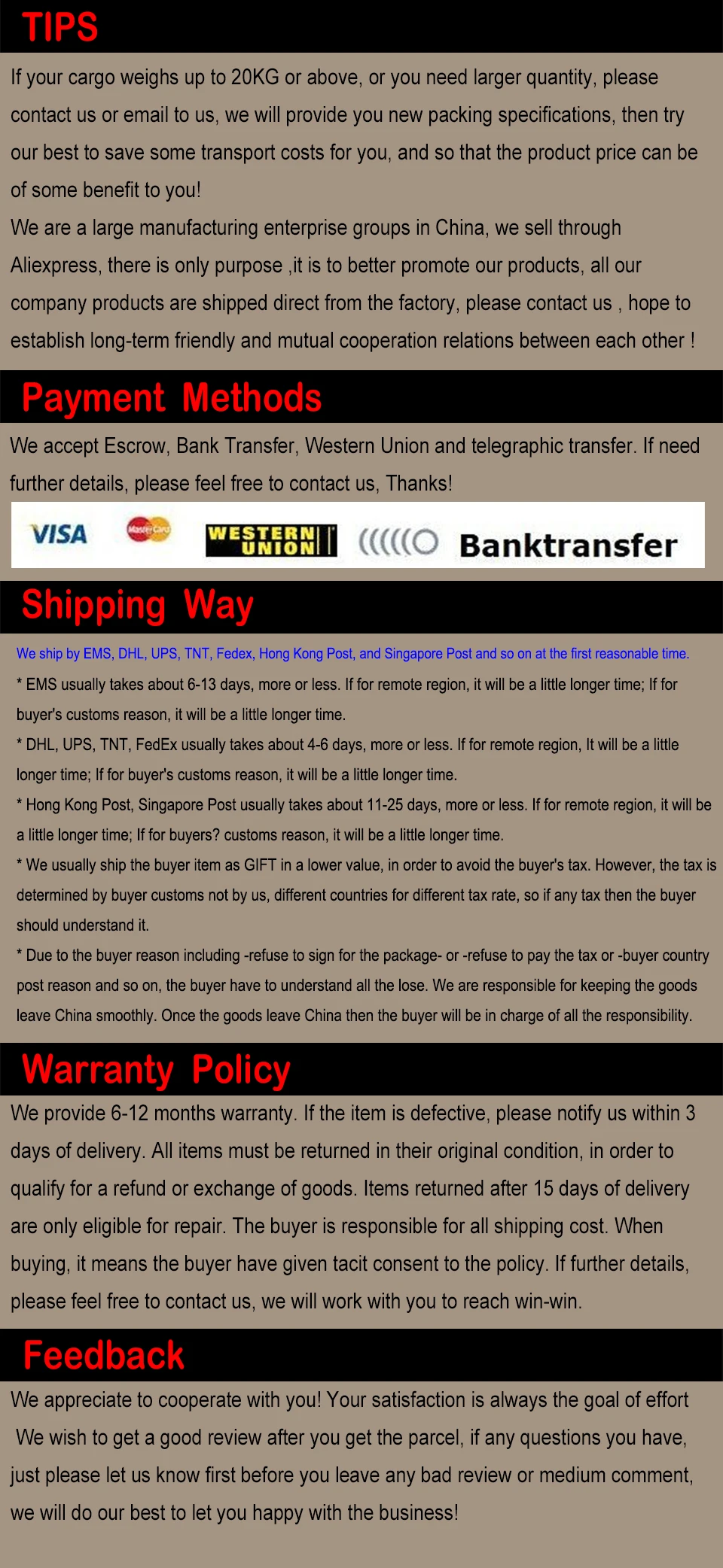 1) Все товары бесплатной доставки, продавец несет ответственность за стоимость доставки из шэньчжэнь китая в место назначения. Китайские тарифы, относятся к оплате сборов, экспортной декларации сборов или таможенных сборов для счета продавца.