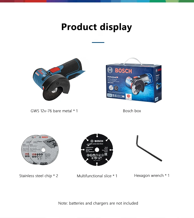 ①GWS 12V-76 неизолированный металл * 1 ② Коробка bosch ③ Срез из нержавеющей стали * 2 ④ Многофункциональный ломтик * 1 ⑤ Шестигранный ключ * 1