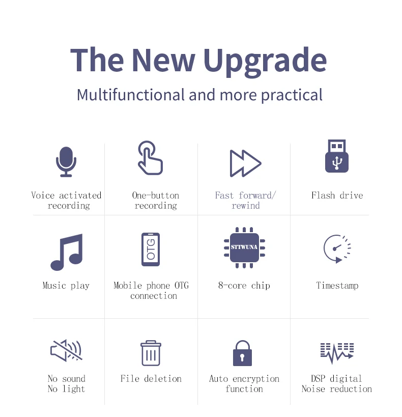 Запись с голосовым управлением Запись одной кнопкой Быстрый вперед/Перемотка Флеш-накопитель Воспроизведение музыки Мобильный телефон соединение OTG 8-ядерный чип Метка времени Нет звука, не светильник Удаление файлов Функция автоматического шифрования Цифровое шумоподавление DSP