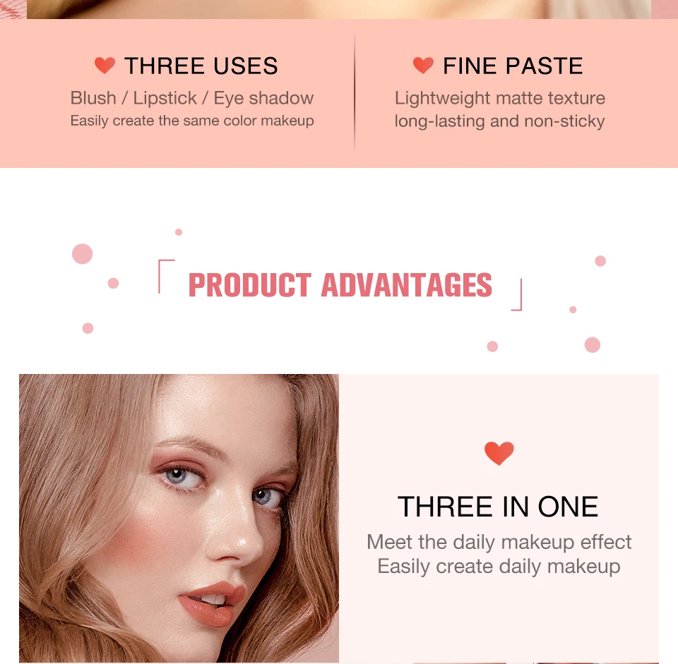 ♥Тени для век 3 в 1 помада, румяна, легко получить Одноцветный макияж.