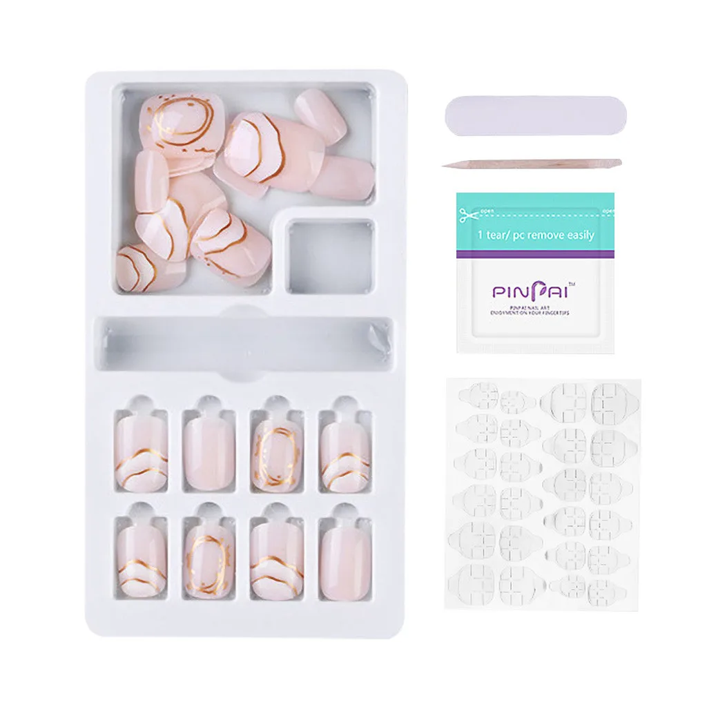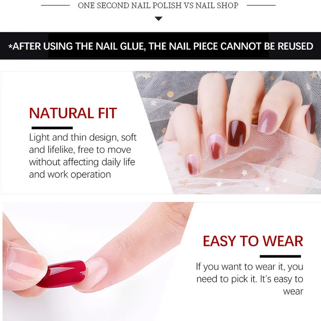Легко Операции: Очистите ногти, затем выберите правильный размер ногтей, нанесите Наклейте наклейку на ногти и нажмите и удерживайте в течение 20 секунд. DIY мгновенные ногти, 3 минуты применяются дома вместо 30 минут в салоне.