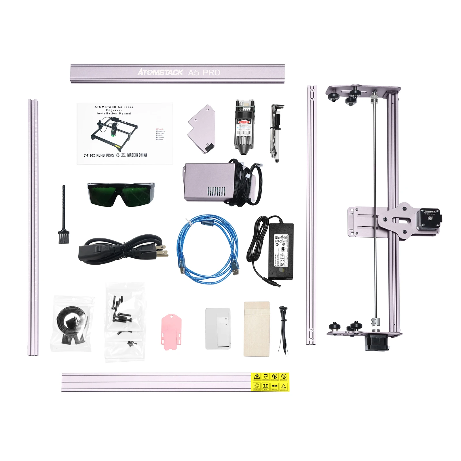 Модель продукта: ATOMSTACK A5 Pro Каркасный Материал листового металла + алюминиевый профиль Вход Напряжение: AC100-240V В переменного тока, 50/60 Гц Выходное напряжение: DC12V, 5A Размер Гравировки: 410*400 мм Предметы для резьбы: все дерево, бамбук, картон, пластик, кожа, печатная плата, оксид алюминия, неотражающее покрытие и Лакированный металл. Режущие предметы: картон, Нетканая ткань, тонкая древесина, акриловый материал, Тонкая Пластиковая доска. Мощность лазера: 40 Вт Лазерный Выход Мощность: 5-5,5 W Длина волны: 455 ± 5 нм Точность гравировки: 0,01 мм Метод фокусировки: лазер с фиксированным фокусом, нет необходимости фокусировать Лазерная защита безопасности: когда лазер находится под контролем, двигатель не двигается и лазер загорается. Если пользователь забывает выключить лазер, лазер автоматически выключается после периода воздействия, чтобы предотвратить пожар. Движение удара будет обнаружено, и машина остановится, чтобы избежать опасности. Защитная крышка лазера: защищает глаза пользователя и предотвращает захват питомцев лазерным пятном. Операционное программное обеспечение: LaserGRBL, LightBurn, поддержка Win XP/Win 7/Win 8/Win 10 system. Входной Формат: NC, BMP, JPG, PNG, DXF и т. Д. Метод передачи данных: подключение USB Размер оборудования: 57*60*27 см/22,4*23,6*10,6 дюйма Вес оборудования: 3426 г/7,6 фунтов Размер посылка: 62*34,5*13 см/24,4*13,6*5,1 дюйма Посылка Вес: 5072g / 11.2lbs