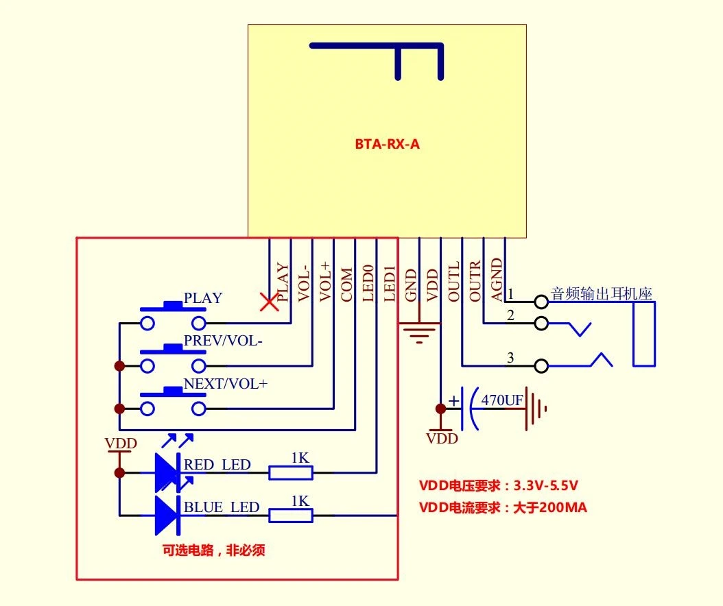 6) СВЕТОДИОДНЫЙ 0, подключите к красному светодиодный светильник. (Модуль аудио приемника Bluetooth имеет встроенный светодиодный светильник, который можно пропустить)