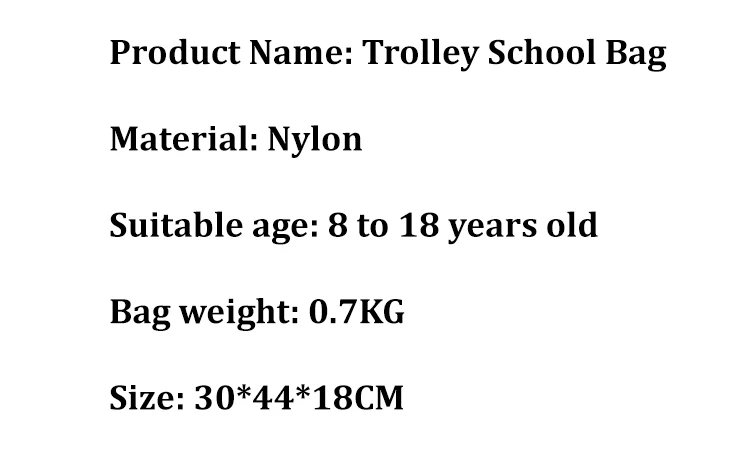 Название продукта: школьная сумка на колесиках Материал: нейлон Подходящий возраст: от 8 до 18 лет Вес сумки: 0,7 кг Размер: 30*44*18 см Особенности: Материал для защиты окружающей среды Дышащий Несколько отделений Стильный внешний вид Водонепроницаемый Безопасный материал Износостойкий и устойчивый к царапинам Легкая конструкция Легко разбирается, Многофункциональное использование Шестиколесная конструкция для подъема по лестнице Удобные и дышащие Эластичный плечевой ремень Конструкция большой емкости Многофункциональный дизайн Разумное хранение