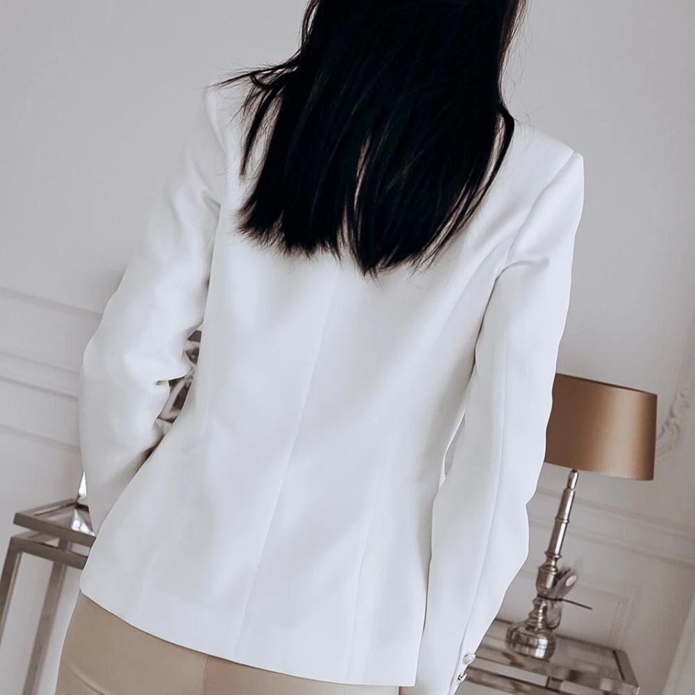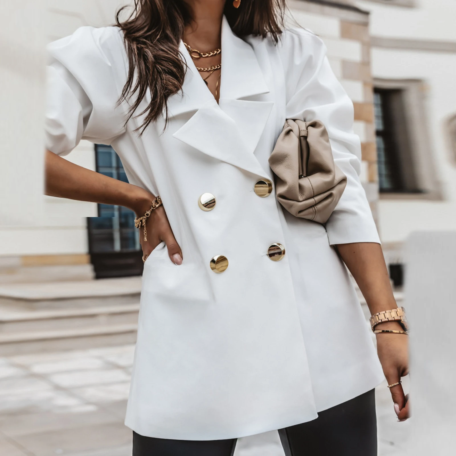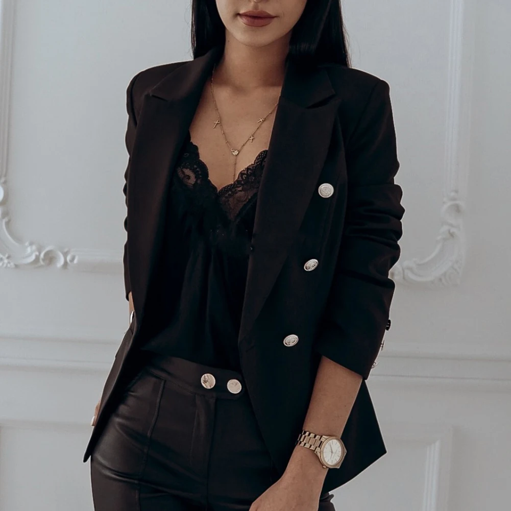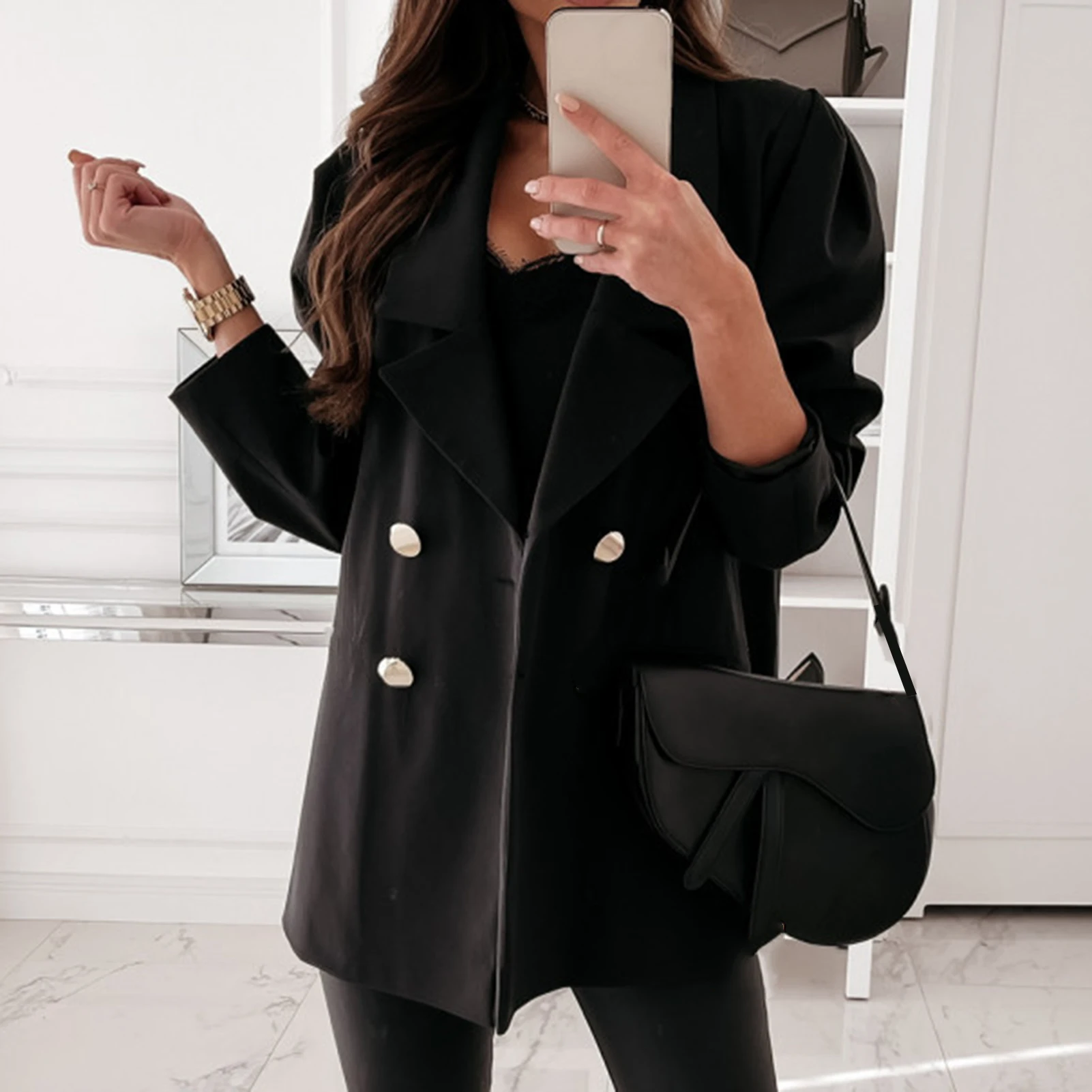 Это повседневный, но модный двубортный блейзер с отворотом, однотонным и длинным рукавом.