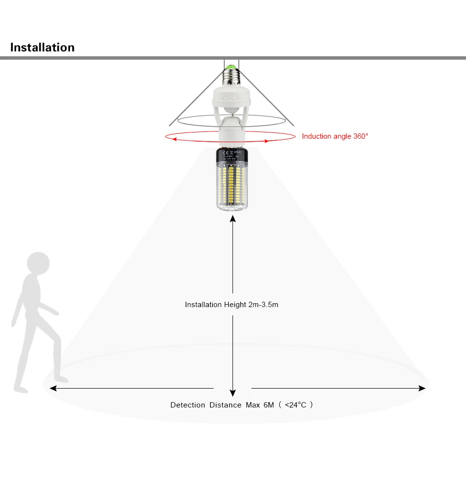 Диапазон обнаружения: 360 ° Источник питания: 110-240 В/переменный ток Мощность частота: 50/60 Гц Номинальная нагрузка: <60 Вт Расстояние обнаружения: 6 м Макс (<24 °C) Время задержки: Мин. 10 сек ± 3 сек Макс. 5 мин ± 1 мин Окружающий светильник: 3-2000LUX (регулируемый) Установка Высота: 2 м-3,5 м