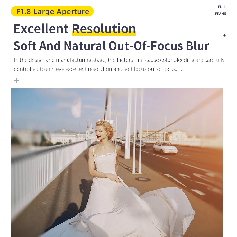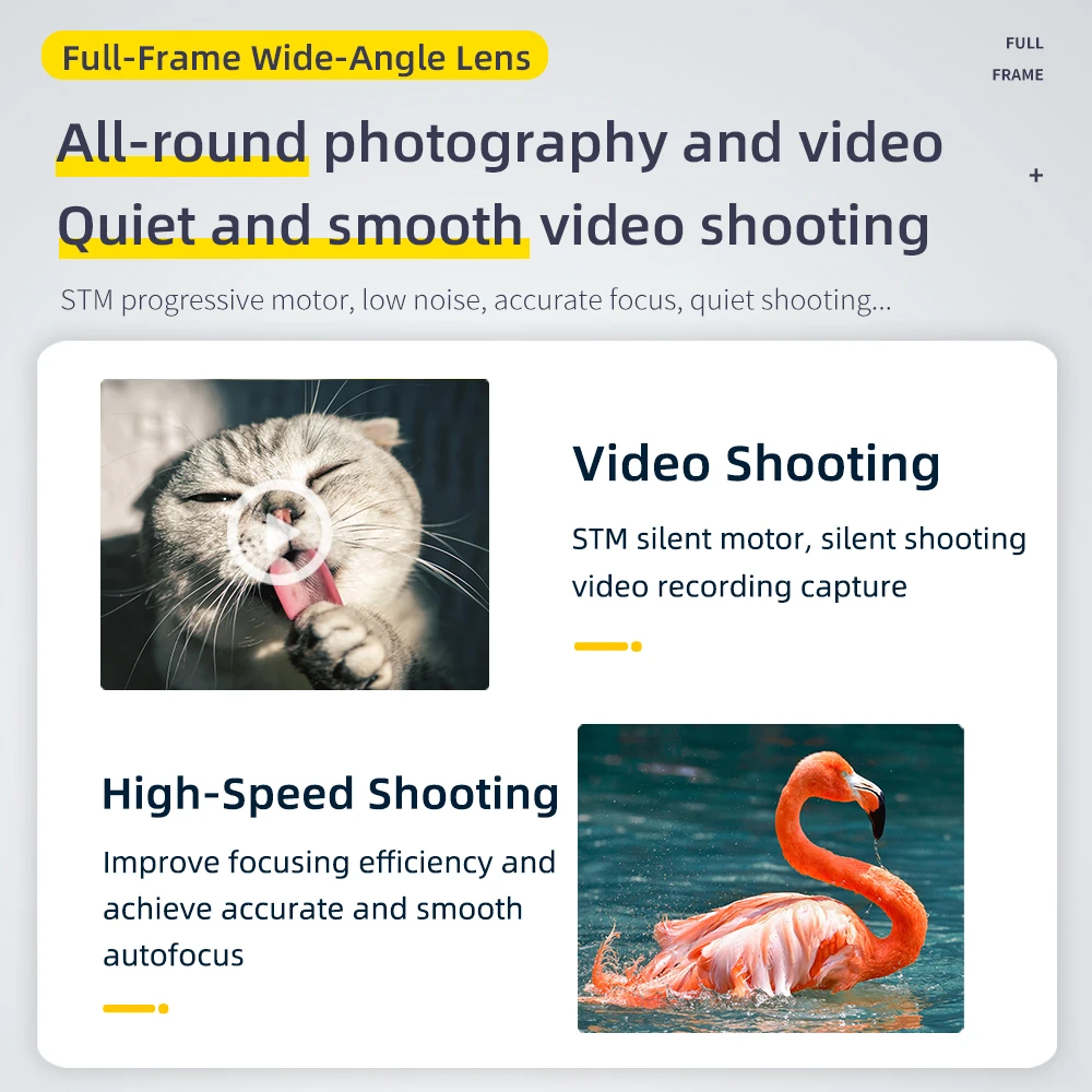 • Широкоугольный объектив с автофокусом • Светильник весом и высоким качеством изображения, встроенный STM + ходового винта типа шаговый двигатель • Стабильный и плавный автофокус, легкая сборка фокусировки • Небольшой эффект дыхания, поддержка фокусировки глаз • Отличное разрешение, мягкое и естественное размытие вне фокуса