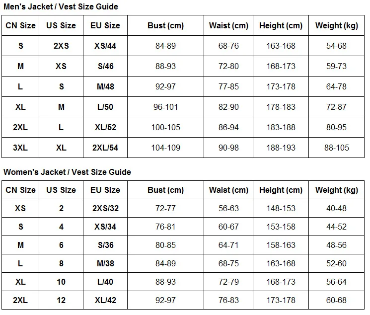 Руководство по размерам куртки/жилета: