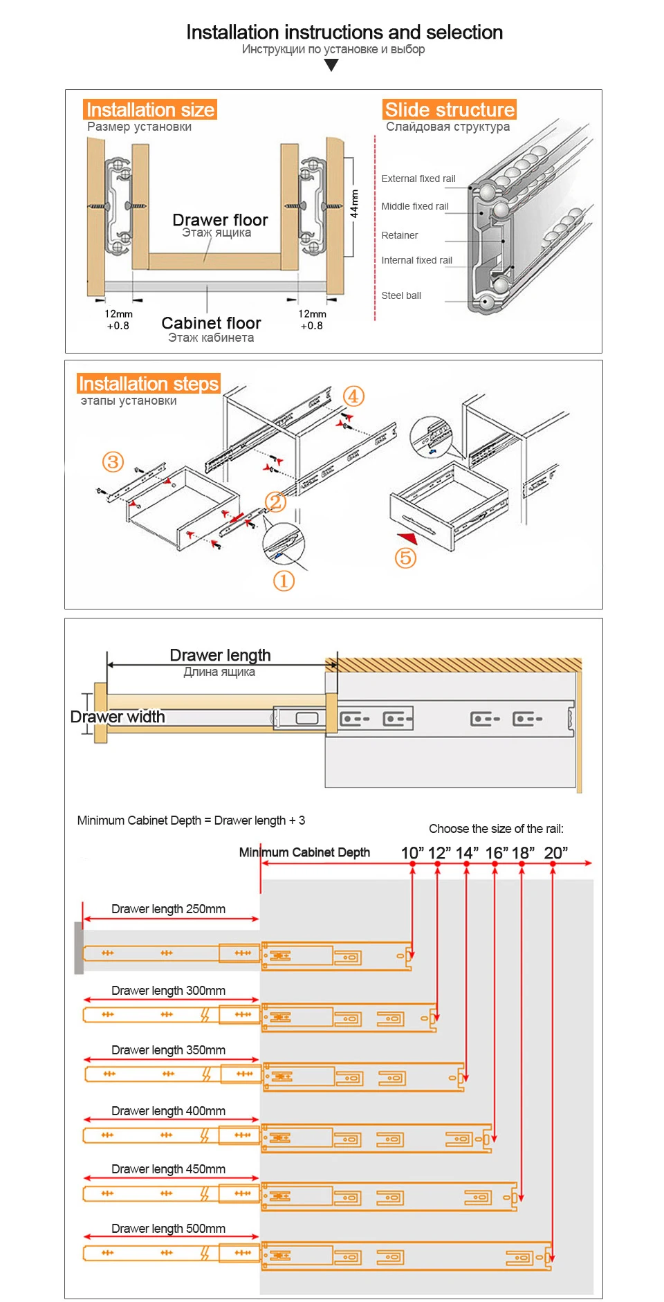 Три секции Толщина: внутренней направляющей 1,2 мм, средний рельс 1,0 мм, внешняя рельс 1,0 мм
