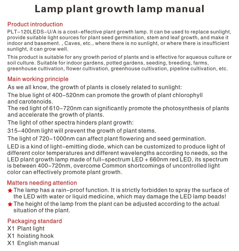 1. Светильник для выращивания был разработан с полным спектром (100 полный спектр + 20 красный светодиодный), дает идеальную длину волны для всех растущих сцен. Подходит для посева, прорастания, вегетативного и цветения. 2. Простота установки: подвесной комплект делает эту лампу для выращивания намного проще в сборке. Корпус из алюминиевого материала, отличные чипы помогают вашим растениям расти лучше. 3. Регулируемое покрытие: высокая яркость растут светильник включает в себя более 0,9 квадратных метров.