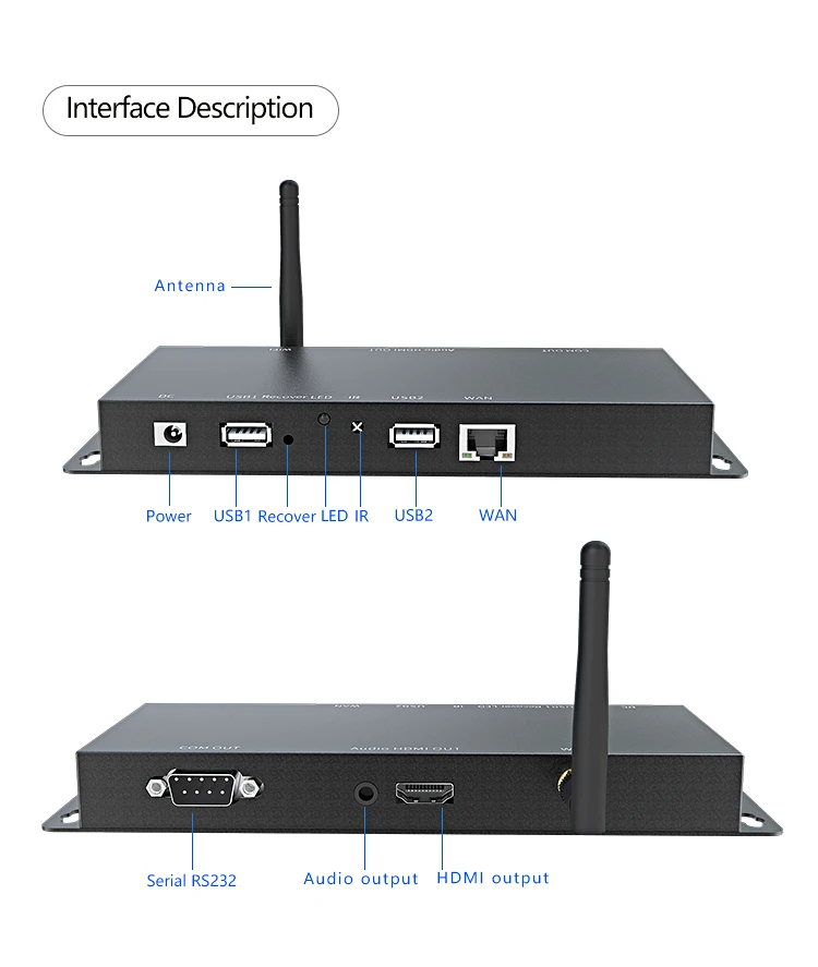 4) терминал поддерживает различные методы сетевого подключения, включая Ethernet и т. д. С входным входом VGA и выходным интерфейсом HDMI конфигурация сетевого подключения должна быть независимым интерфейсом управления и может быть установлена удаленно.