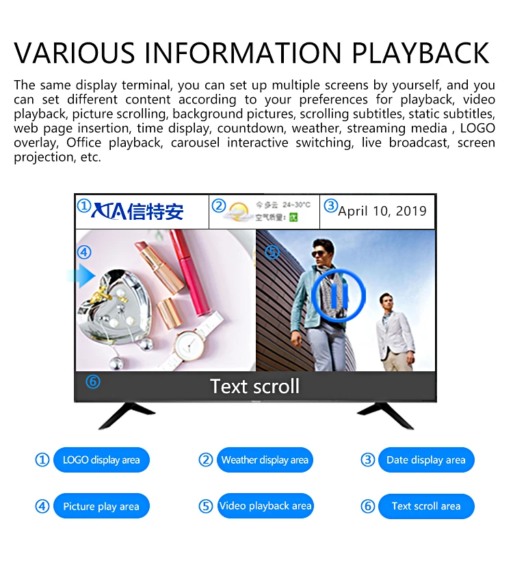 3) дисплей терминала: дисплей терминала в основном включает контроллеры, передатчики и различные Дисплейные устройства. Он принимает и выполняет мультимедийную информацию и элементы управления, контролируемые центром. Он автоматически транслируется в соответствии с расписанием через программное обеспечение терминала. Терминальный дисплей может создавать унифицированную информационную платформу на основе различных устройств отображения, таких как ЭЛТ-дисплеи, жидкокристаллические дисплеи, плазменные экраны, проекторы, сенсорные машины и все-в-одном.