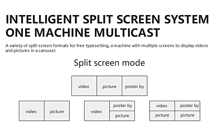 8) поддерживает свободный Разделенный экран, экран можно разделить на несколько областей, соотношение размеров площади можно разделить произвольно, содержимое дисплея области поддерживает управление и предварительный просмотр материала, по крайней мере, видео, аудио, субтитры, изображения, субтитры, цифровые часы, прогноз погоды, потоковые медиа и другие типы материалов, И вы можете настроить классификацию материала, поддержку для создания материала разделенного экрана путем перетаскивания и вытягивания непосредственно на веб-странице.