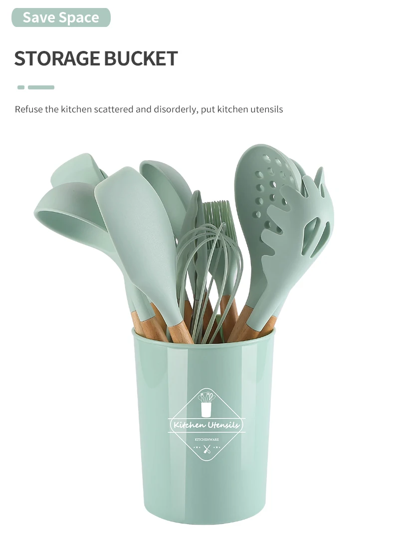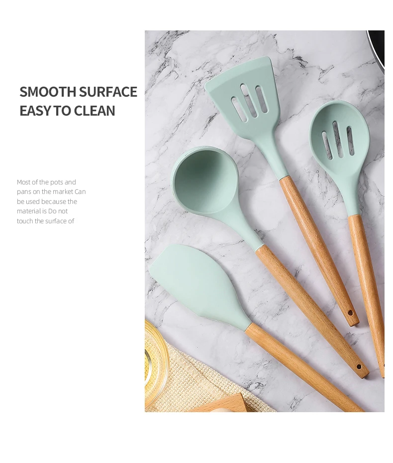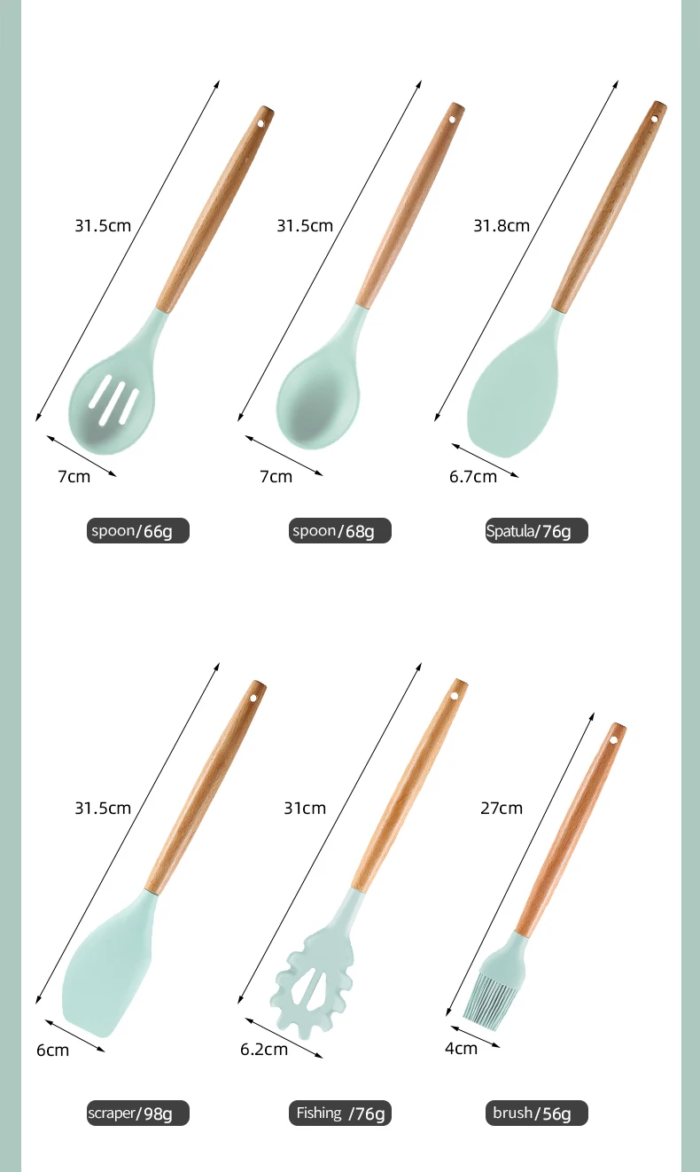 Защита окружающей среды, нетоксичные, термостойкие, антипригарные, прочные, безопасные, легко чистятся продукты для кухонных приборов Количество наборов: 9PCS-A,9pcs-B 10PCS-A,10PCS-B, 11 шт, 12 шт. в комплекте: шпатель, щетка для протирания, шпатель с острым носком, Тернер с закругленными краями, ковш, Тернер с прямыми краями, ложка, щипцы, Паста вилка и идеально подходит для всех типов продуктов и приготовления пищи. Цвет: мятный зеленый/розовый/черный красный серый зеленый Слива Применение: микроволновая печь, тостер, отпариватель, можно варить и стерилизовать. Материал: силикон и деревянная ручка Размер: как на фото