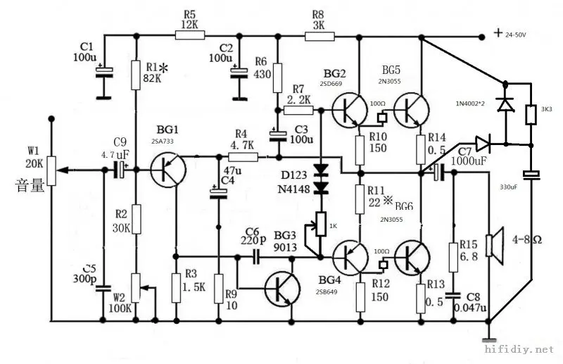 IfQ5,Q6Plastic sealT220In the case of encapsulation,Output power in3-10Between tiles,Perfect for near field listening,For simplicity,Directly on the board,A lot of multiple leads are missing,If you need more power,On boardQ5,Q6No need to install,Choose large plastic or gold seal pipe,Directly through2,3,4,6,7,8External installation, At the same time, increase the supply voltage,The results are satisfactory