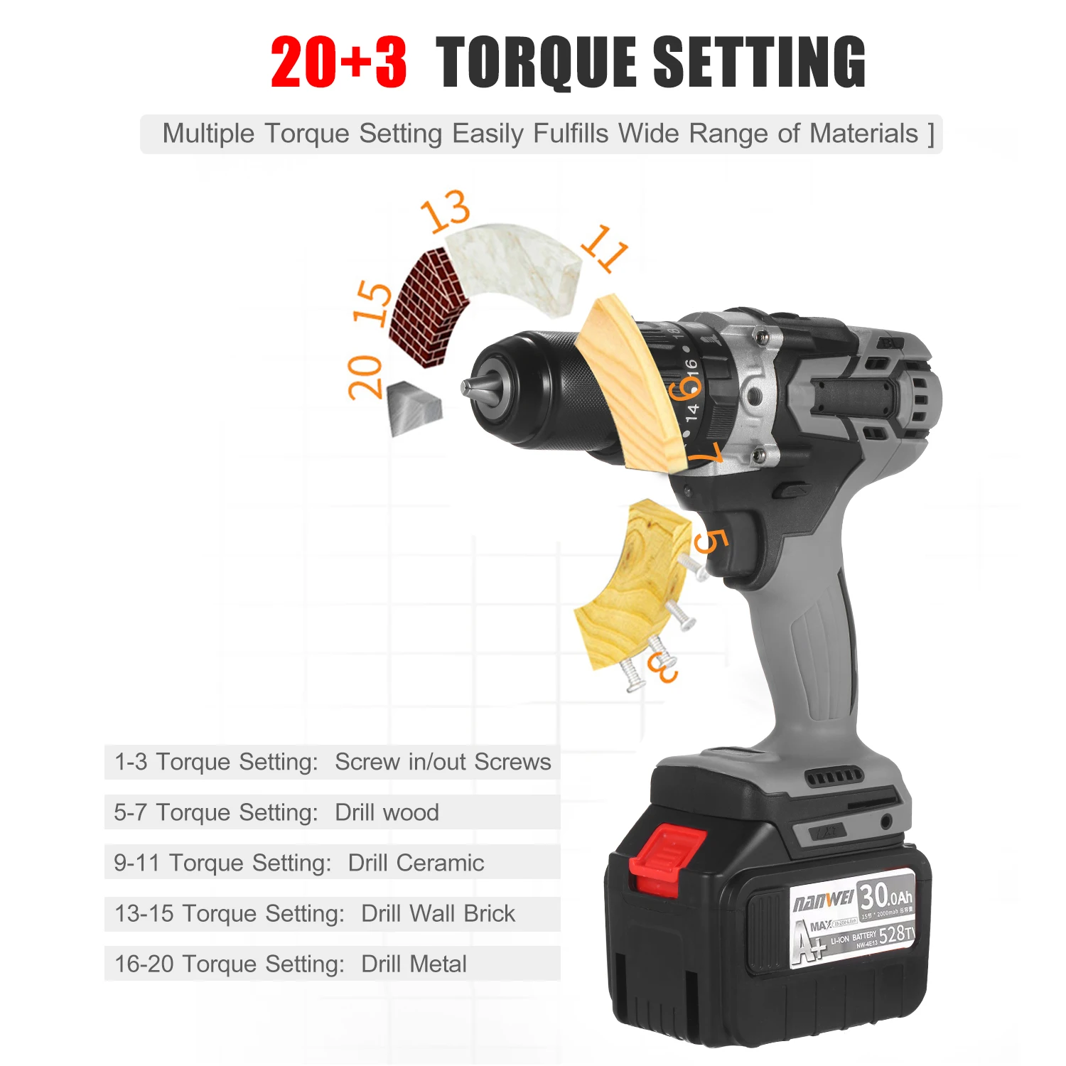 23 положения сцепления и 2 переменной скорости -- 20 + 1 + 1 + 1 настройки крутящего момента, 2 скорости (0-450 об/мин/0-1550 об/мин) регулировка, триггер с переменной скоростью и переключатель вперед/назад обеспечивают благоприятную силу и точное управление для вождения винтов для предотвращения зачистки и бурения в древесине, пластмассе, льду, металле и цветной стали с легкостью. Низкий крутящий момент с первой скоростью для вождения винтов и сверления древесины. Высокий крутящий момент со второй скоростью для сверления стен и функции молотка.