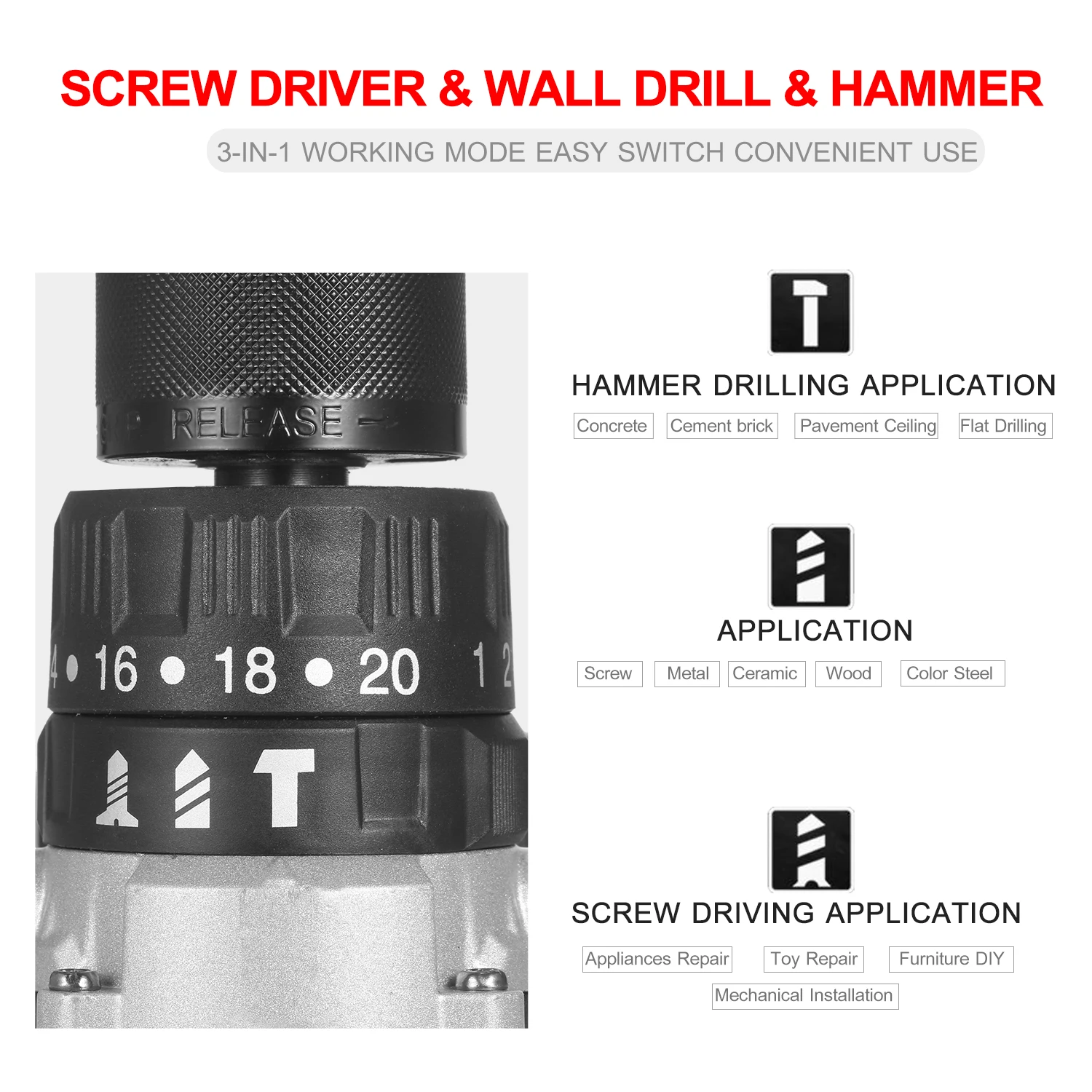Эргономичная Ударная дрель промышленного класса-компактная дрель с мягкой резиновой ручкой обеспечивает удобный захват для легкого управления в одной руке и прекрасно уменьшает усталость в течение длительного времени использования и легкий доступ к тугим зонам. Поставляется с вспомогательной ручкой, которая поможет вам работать в тяжелых условиях, например, сверлить отверстия для льда толщиной 1,25 метров. Отвертка & настенный сверлильный станок & молоток 3-в-1 Рабочий режим позволяет вам решать все работает от светлого до для тяжелых условий эксплуатации.