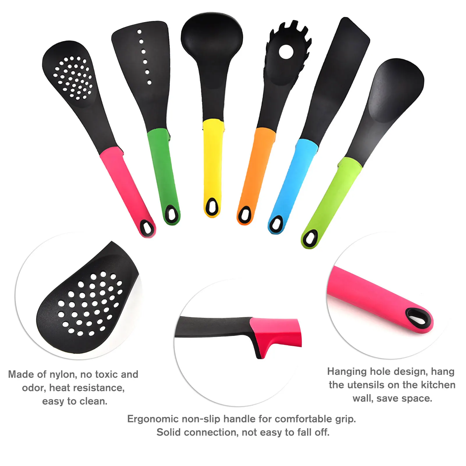 Эргономичная Нескользящая ручка для удобного захвата, не переносит тепло для защиты рук. Надежное соединение, не легко отвалиться. В конце ручки есть отверстие, чтобы вы повесили кухонную утварь на стену, если вам нравится.