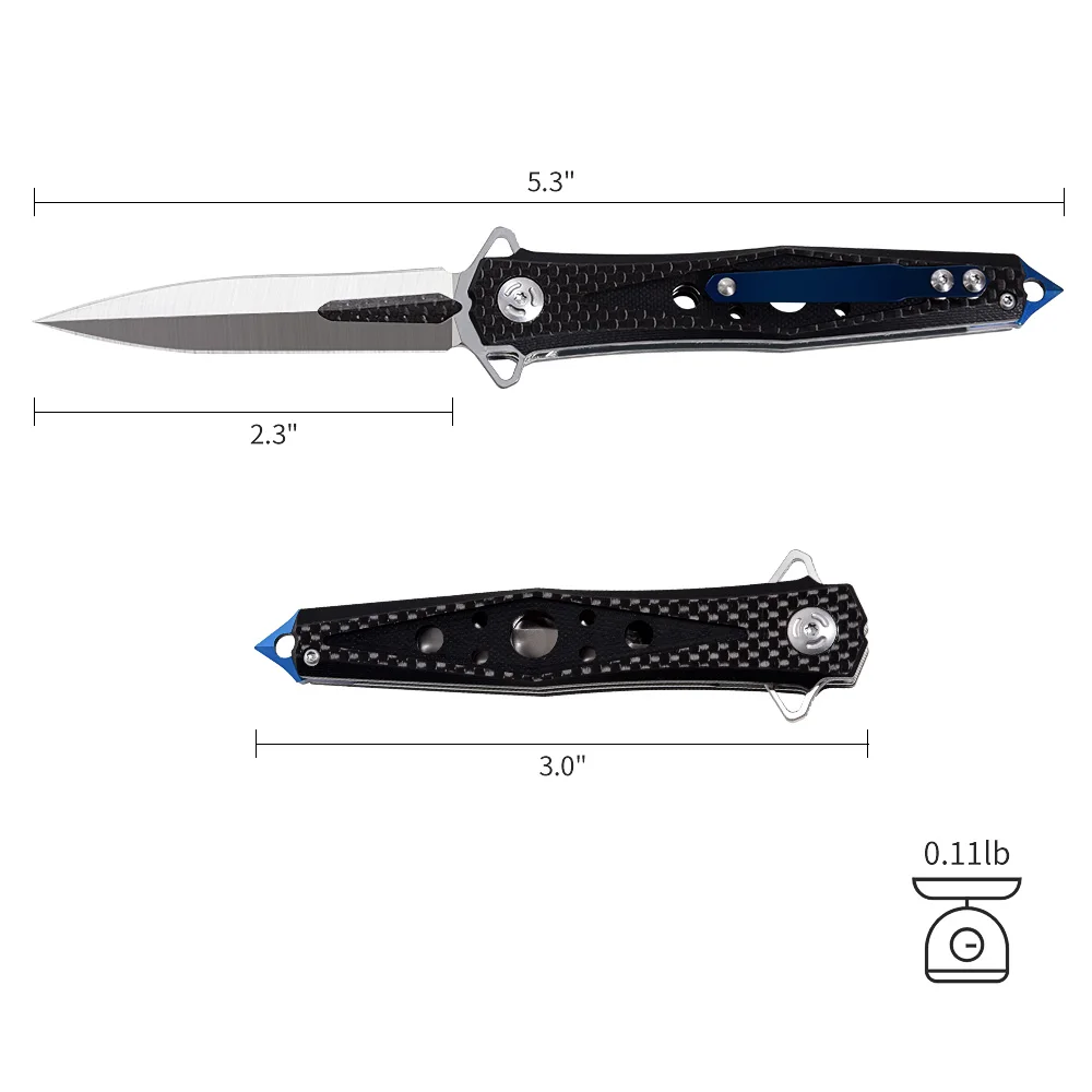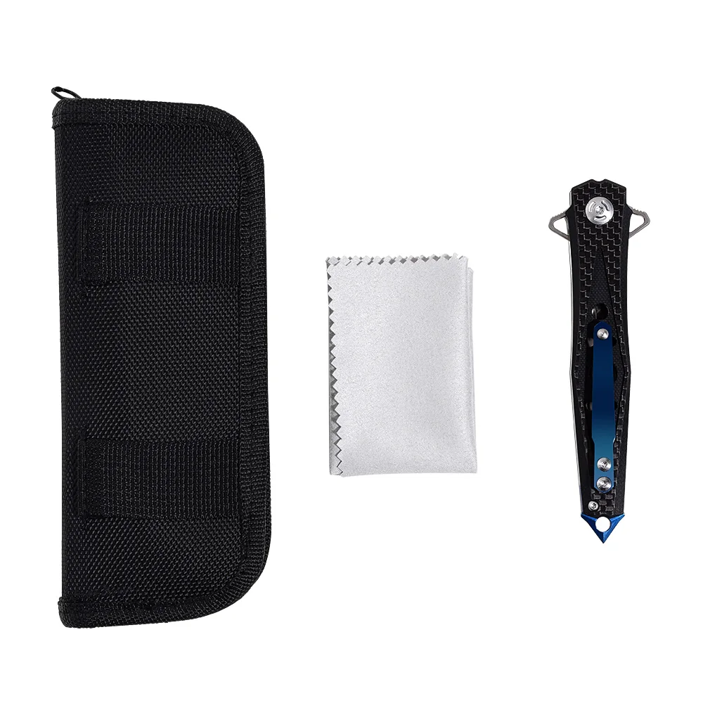 Информация о товаре: Полная длина: 5,3 дюйма Длина клинка: 2,3 дюйма Материал клинка: D2 Длина ручки: 3 дюйма Материал ручки: углеродное волокно Цвет ручки: черный Вес изделия: 100 г