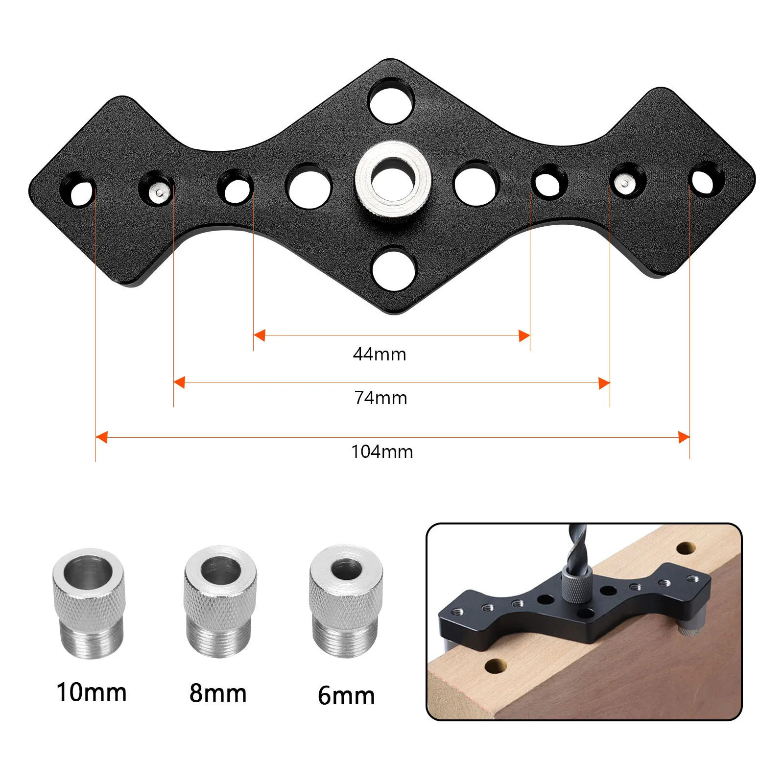 Регулируемый джиг древесины: 2 фиксированные ножки джига сверла легко разбирать и регулировать, подходит для деревянных досок различной толщины 44 мм/74 мм/104 мм.