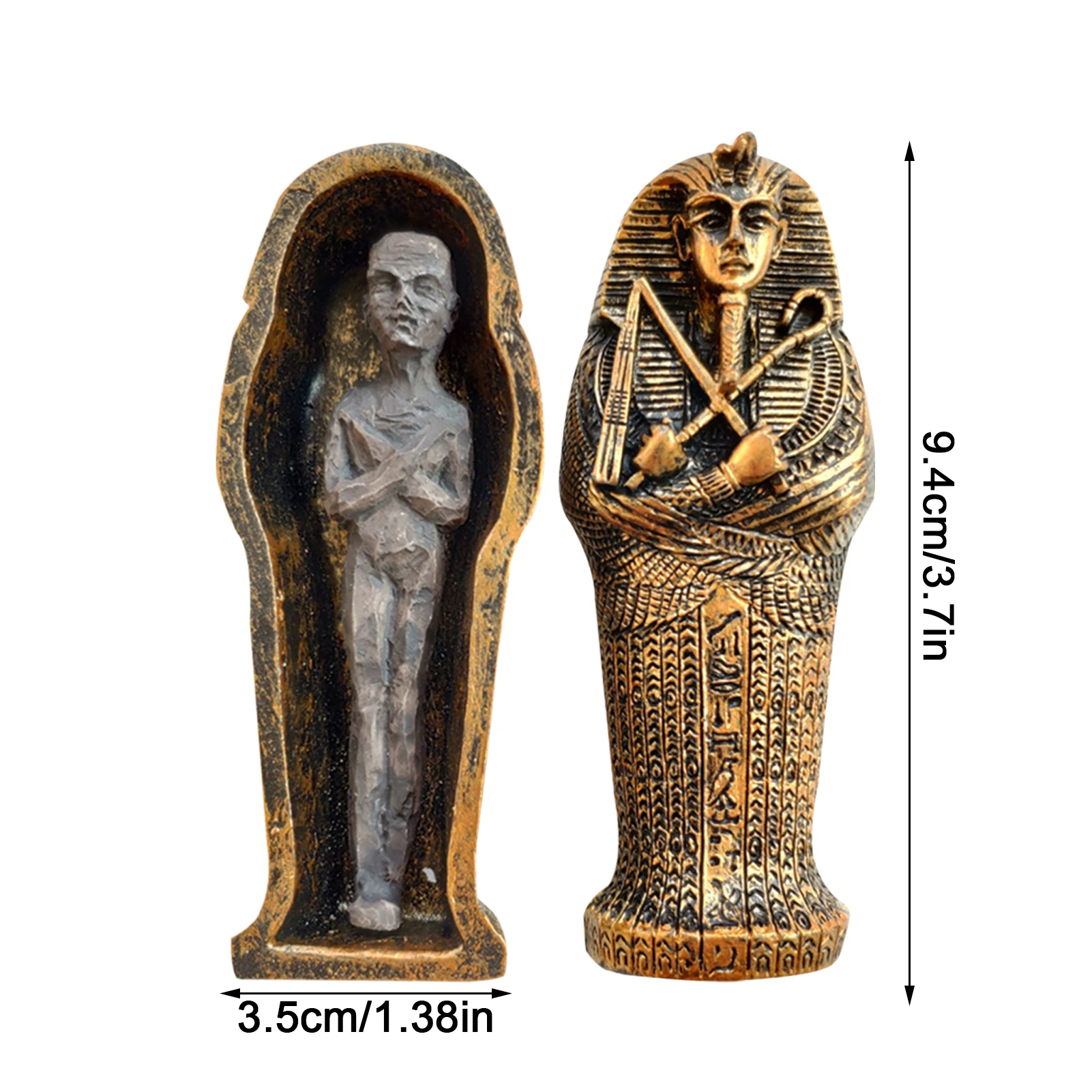 1. Размеры этого статуя египетского фараона в смолы каменные номер 9,4*3,5*3,8 см.2. Из-за ручного измерения возможна погрешность в размере изделия.