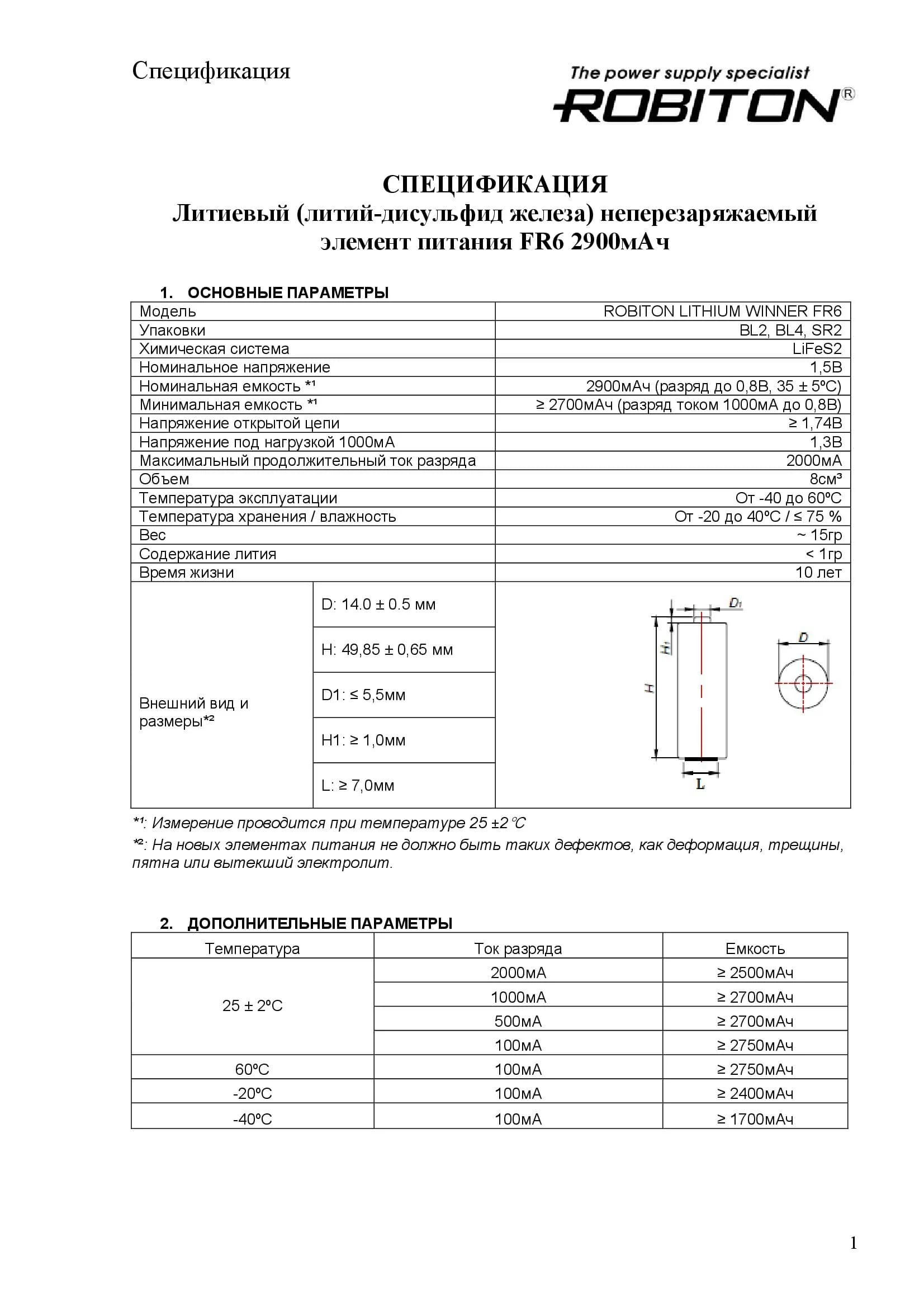 Неперезаряжаемый литий-дисульфид железный элемент питания типоразмера FR6 / AA. Весит на 30% меньше аналогичных щелочных элементов. Сохраняет стабильность работы при высоких токах разряда и низкой температуре.