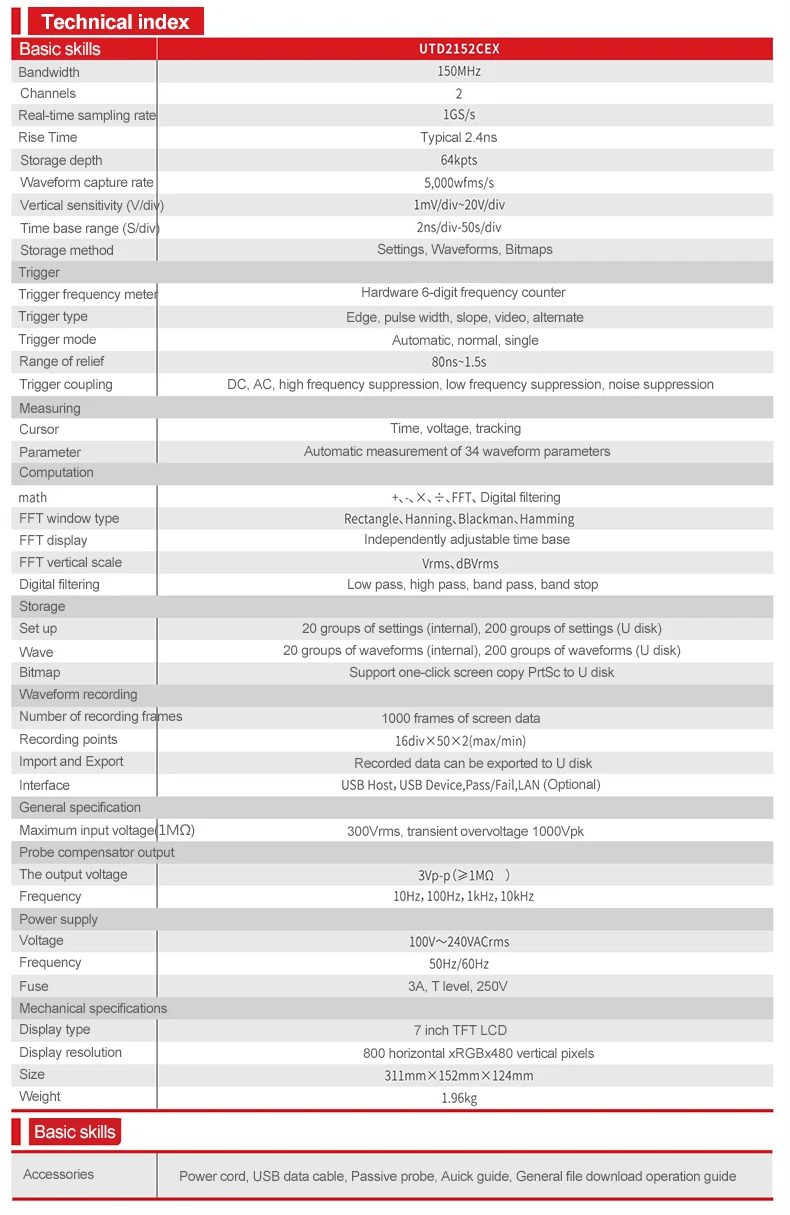 UTD2152CEX is an economical desktop digital storage oscilloscope that meets the key requirements of basic measurement. The simple and clear front panel design is more convenient for users to operate. UTD2000CEX series is confiqured with 150MHz bandwidth, real-time sampling rate is 1GS/s, dual-channel and other perfomance output is provided, and the storage depth is 64kpts. It is a general-purpose design/debugging/testing for the broadest digital oscilloscope market including communications, semiconductors.computers, aerospace and defense, instrumentation, industrial electronics, consumer electronics, automotive electronics, field maintenance, R&D/education and many other fields An oscilloscope designed on demand.