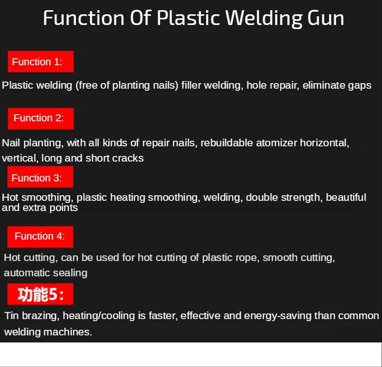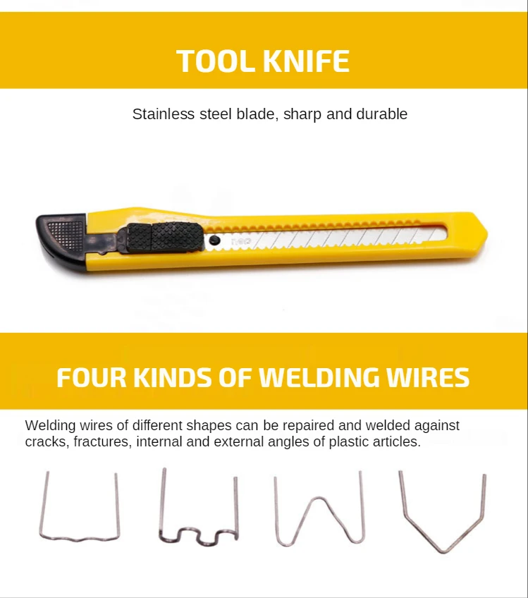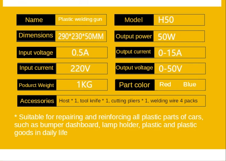 Спецификация: Материал: АБС-пластик и нержавеющая сталь Цвет: красный, синий Входное напряжение: 110 В (правила США) 220 В (британские правила, европейские правила, австралийские правила) Входной ток: 0.5A Выходное напряжение: 0-50 в Выходной ток: 0-15A Выходная мощность: 50 Вт Размер машины: 260x160x45 мм/10.24x6.3x1.77inch Длина кабеля: 1,5 м/4.92ft Описание: 1. По сравнению с сваркой, адгезивами, эпоксидной смолой и т. д., этот сварочный аппарат легко ремонтировать Пластиковые бамперы, мотоциклы, газонокосилки и другие термопласты. Профессиональный сварочный аппарат выдувает их из воды! 2. После ремонта он обладает сильной ударопрочностью и сопротивлением искажениям. 3. Без обучения вы можете использовать скобы и завершить их в течение нескольких минут. Отремонтированный комплект так же долговечен, как и новый комплект. 4. Немедленное техническое обслуживание: ремонт поврежденных частей и продлить срок их службы. Он крепкий после ремонта, с шипами и искажениями. 5. Удобная ручка: резиновая ручка имеет удобное сцепление и не будет чувствовать усталость в течение длительного времени. Быстрая и простая эксплуатация. 6. Широкий спектр применения: подходит для обслуживания бамперов, панелей приборов, держателей ламп, пластиковых колец, радиаторов, автомобилей, мотоциклов и пластиковые устройства. Посылка включает в себя: 1 * Пластиковый сварочный аппарат 50 * плоские скобы 50 * внешние Угловые скобы 50 * внутренний угол скобы 50 * волнистые скобы 1 * режущие плоскогубцы 1 * коробка для переноски 1 * Руководство пользователя Примечание: Из-за калибровки цвета каждого монитора цвет может немного отличаться. Из-за ручного измерения возможны незначительные отклонения.