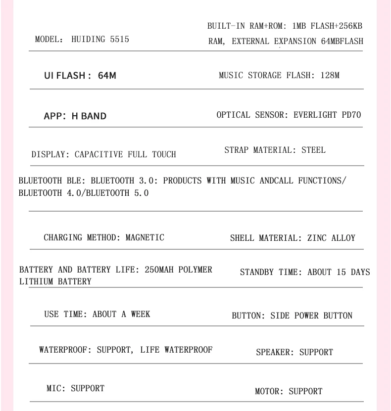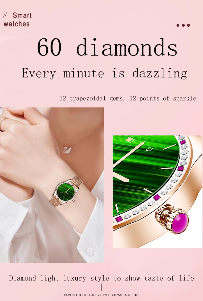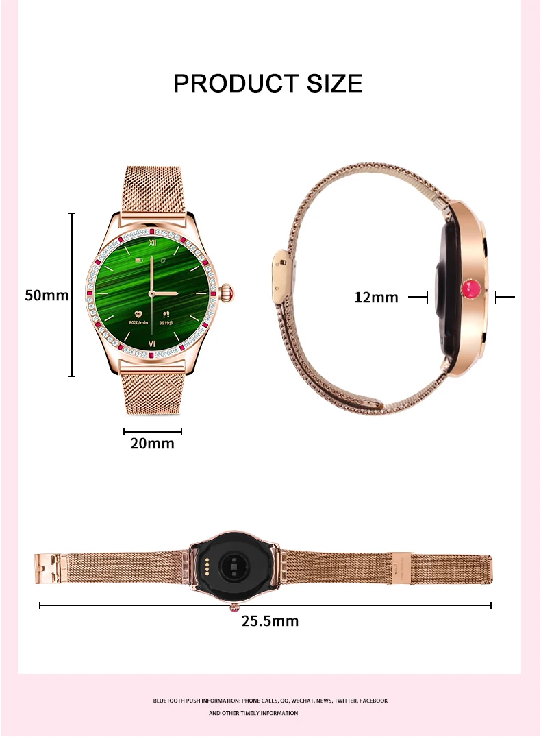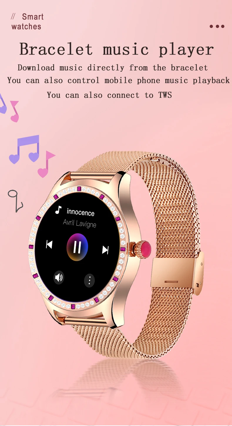 Параметры продукта: Продукт: женские дизайнерские Смарт-часы Системные требования: Android 4,4 и выше, IOS 8,0 и выше Bluetooth: Bluetooth 5,1 обратно совместим Основная платформа управления: Huiding 5515 Емкость аккумулятора: полимер 250 мА Экран: 1.28TFT Разрешение 240*240 Нормальное использование: одна неделя Время работы в режиме ожидания: полмесяца Приложение: H Band Водонепроницаемость: IP67 водонепроницаемый Особенности: Двойной Bluetooth, 5,1 отвечает за передачу данных, 3,0 отвечает за передачу аудио Особенности: локальная музыка, мобильный телефон, воспроизведение Bluetooth, звонки/входящие звонки, История звонков, контакты, пользовательские циферблаты, несколько языков Основные функции: секундомер, обратный отсчет, найти мобильный телефон Функция мониторинга здоровья: несколько режимов упражнений, сон, частота сердечных сокращений, кровяное давление Функция напоминания: напоминание о будильнике, напоминание о сообщениях SMS/app, напоминание о отключении Bluetooth, напоминание о пульсе, напоминание о сидячем положении, напоминание о цели упражнений Обычные Функции: привязка устройства, обнаружение износа, включение запястья для включения экрана, регулировка яркости, продолжительность блокировки экрана, основные настройки стиля интерфейса, режим низкого энергопотребления, режим не беспокоить Другие функции: фотографирование, женские функции, Сброс пароля, трансляция устройства, настройки переключателя Язык: Язык браслета: китайский, английский, японский, немецкий, французский, итальянский, русский, испанский, португальский Язык приложения: китайский, традиционный китайский, английский, японский, корейский, немецкий, русский, испанский, итальянский, французский, вьетнамский, португальский, турецкий, чешский, польский, персидский