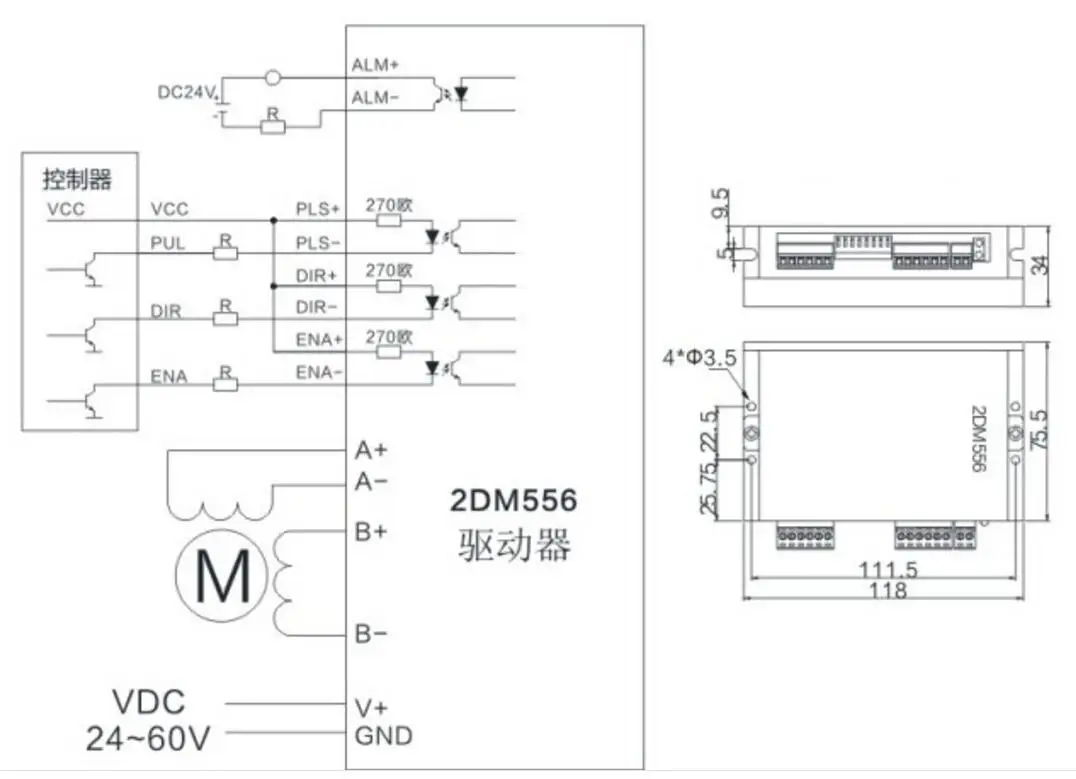 Introduction: JMC 2DM556 is new digital stepper motor driver which adopts latest 32-bit DSP control technology and built-in microstepping technology. Users can set microsteps within 25600step/rev, and any current value within rated current range. 2DM556 driver greatly improves stability and reduces noise under low subdivision. Automatic parameter tuning is integrated inside this driver, can help automatically adjust to the best operation parameters to maximize performance of different stepper motors. The new 32-bit DSP technology Optically isolated differential inputs (26LS32) Ultra-low noise and vibration The range of micro steps is 2-128 Built in 500 times high frequency micro steps Driver 2 phase step motor with 4leads,6leads and 8leads Current settings is optional between ratings current will automatically halved when stand still Pulse frequency response up to 200KHz Overvoltage, undervoltage, short circuit protection Alarm output function I / O ports