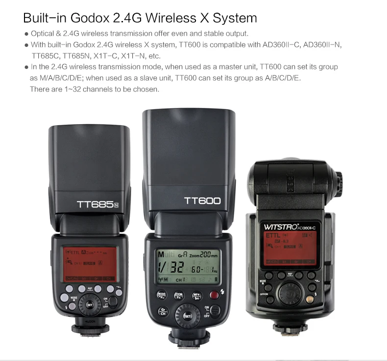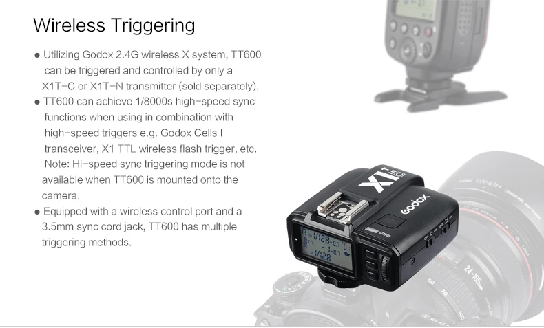 Эта вспышка TT600 использует беспроводную X-систему Godox, со встроенной беспроводной передачей 2,4G, ее можно использовать с Godox AD360II-C/AD360II-N flash, TT685C/TT685N flash, x1T-C/X1T-N триггер и другие устройства с беспроводной системой управления. При использовании с беспроводным триггером вспышки Godox X1 TTL он может осуществлять дистанционное управление, высокоскоростную синхронизацию и другие функции, что делает вашу съемку проще и проще.