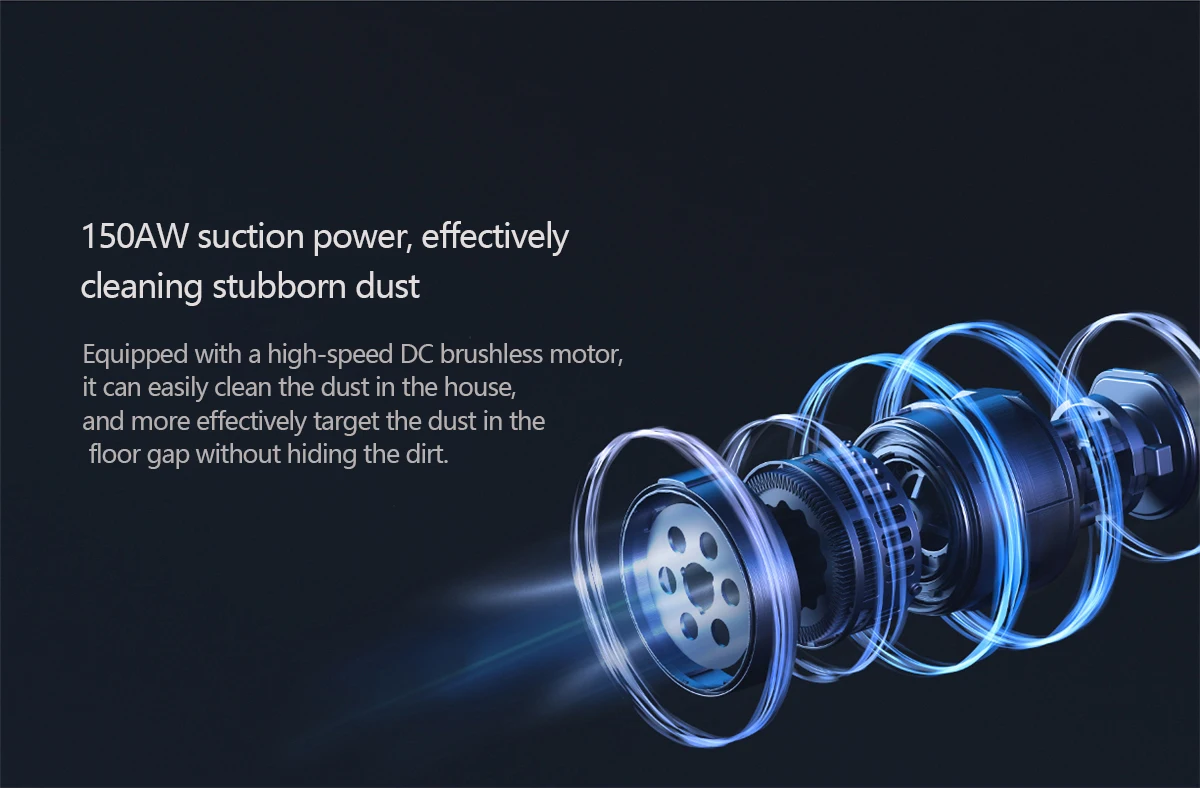 Мощность всасывания 150AW, эффективно очищает стойкую пыль Оснащенный высокоскоростным бесщеточным двигателем постоянного тока, он может легко очистить пыль в доме и более эффективно использовать пыль в напольном зазоре, не скрывая грязь.