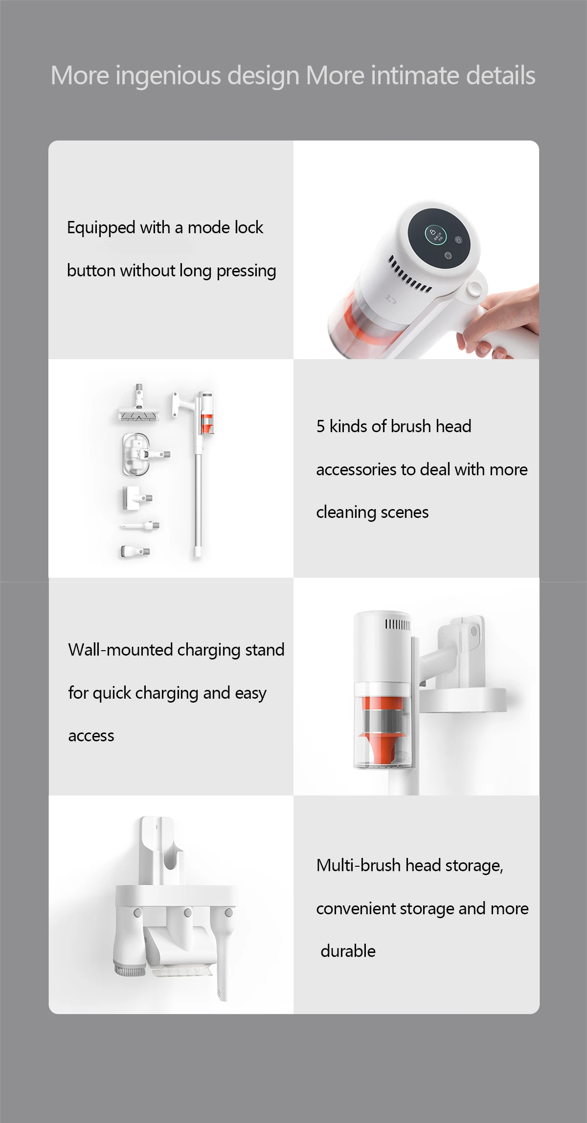 Более оригинальный дизайн более интимные детали -- Оснащен кнопкой блокировки режима без длительного нажатия -- 5 видов аксессуаров для головки щетки для более очистки сцен -Настенная Подставка для зарядки для быстрой зарядки и легкого доступа -- Многощеточная головка для хранения, удобное хранение и более прочный