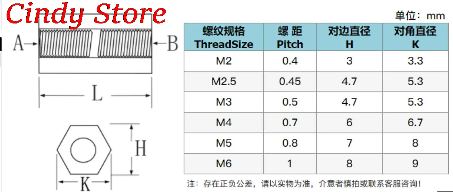Male-Female spacer: M2/2.5/3/4 * L (spacer length) + 3/6mm (outside thread length)
