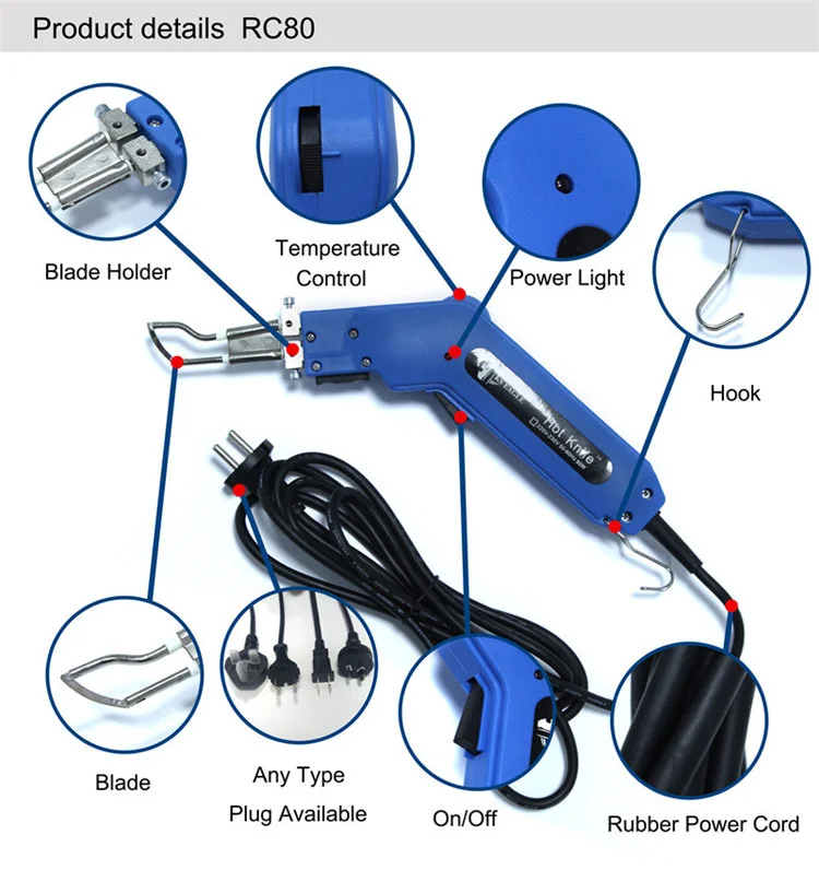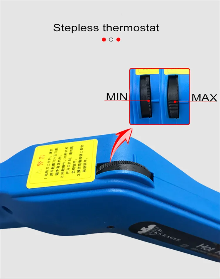 Посылка входит Резак для ткани X 1 Лезвие X 1 Кисть X 1 Руководство пользователя X 1 Предупреждение: 1. Избегайте прямого контакта между двумя держателями лезвий из-за короткого замыкания. 2. Поверните ручку регулировки температуры в среднее положение, поместите лезвие на режущий объект, а затем нажмите на триггер. Горячий Нож предварительно нагревается в течение нескольких секунд для резки. Рекомендуется сначала провести тест на резку отходов. 3. Лучше всего поддерживать температуру и скорость при резке. 4. Снизите температуру лезвия или периодически отпустите переключатель, если осталось слишком много дыма