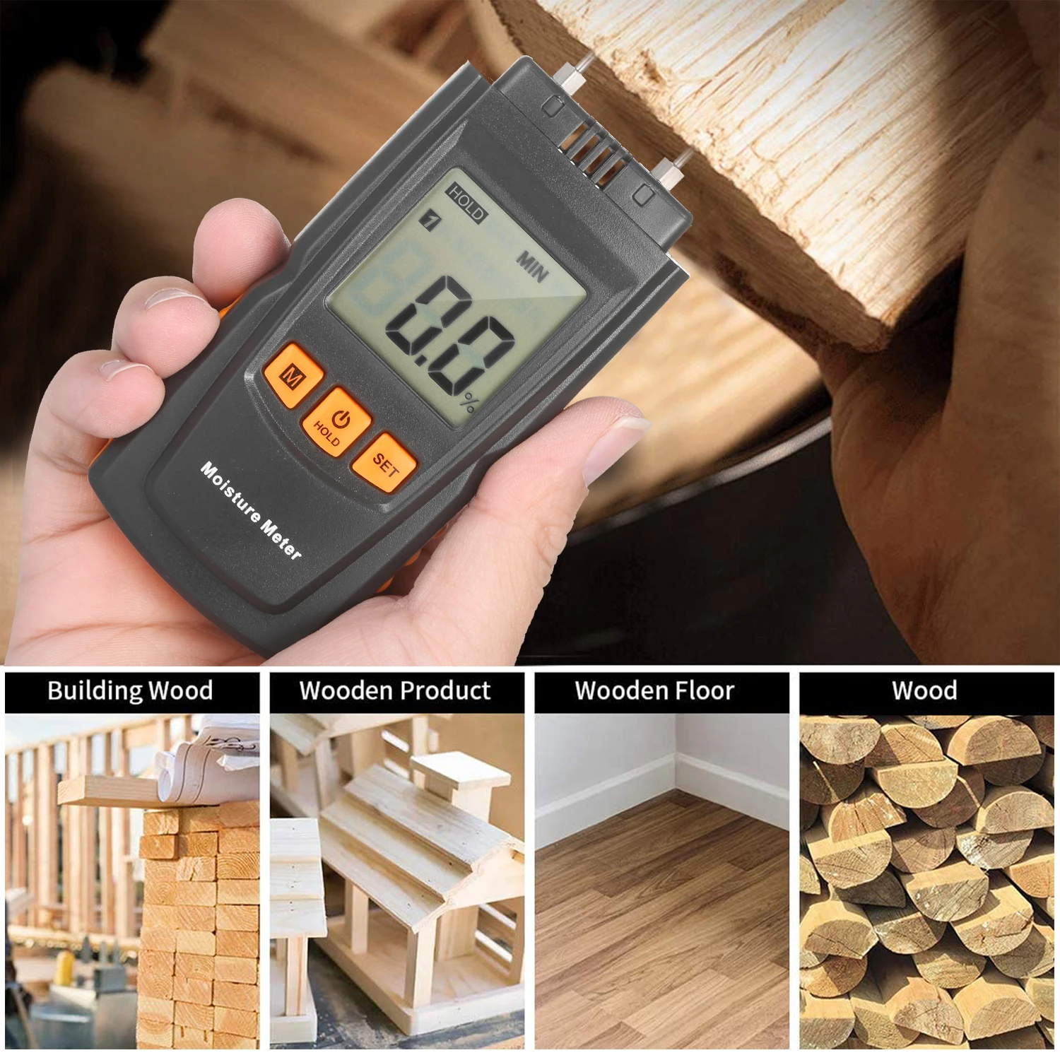 Диапазон измерения влажности древесины: 0-24%, 0-30%, 0-37%, 0-41%, 0-6.8%, 0-6.6%, 0-6.0%, 0-12.2% (четыре вида дерева и другой материал)