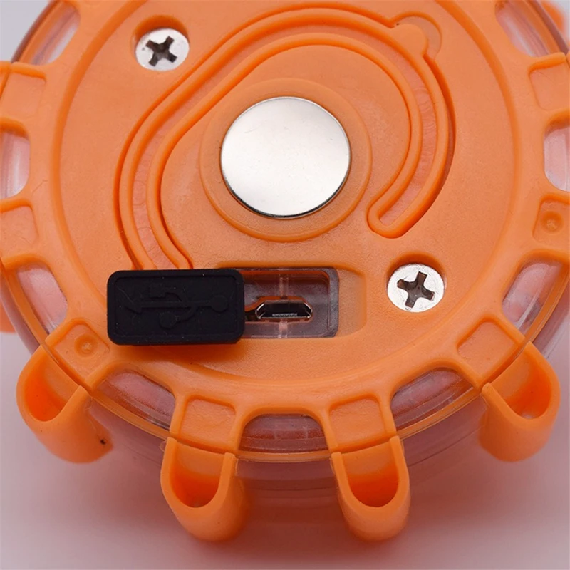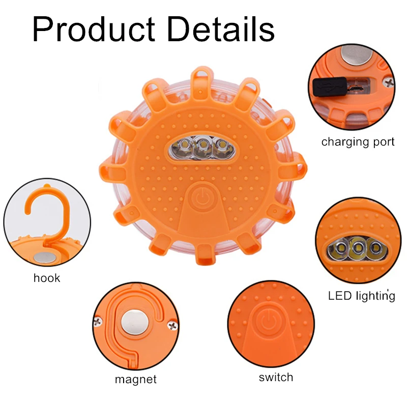 Product Features: With high beam flashing effect, product shell color: orange. The product is equipped with a strong suction magnet that can attract the roof and rear warnings, and can also be placed on the ground for warning. The shell is made by injection molding of high-strength transparent engineering plastics, and it is covered with TPE thermoplastic elastic plastic, which is anti-rolling, waterproof, dustproof, oil resistant and corrosion resistant. Power supply: Built-in lithium ion battery,USB rechargeable How to use: The front of the warning light uses a single button to control one of the 9 built-in modes or shut down. In the working state, press and hold the switch for 2 seconds to automatically shut down. At the same time, there are two LED flashing prompts and a shutdown memory function. In which flash mode is turned off, it will be in that flash mode the next time it is turned on. Product Specification: Product name: Roadside Safety Light Product material: Outer material TPR, inner material PC Quantity of LED lamp beads: 12 red lights + 3 white lights Light color:red and white Product shell color: Orange Product size: 100*35mm Input: DC5V Power: 4W Waterproof coefficient: IP44 Power supply: Built-in lithium ion battery Package weight: 0.25kg