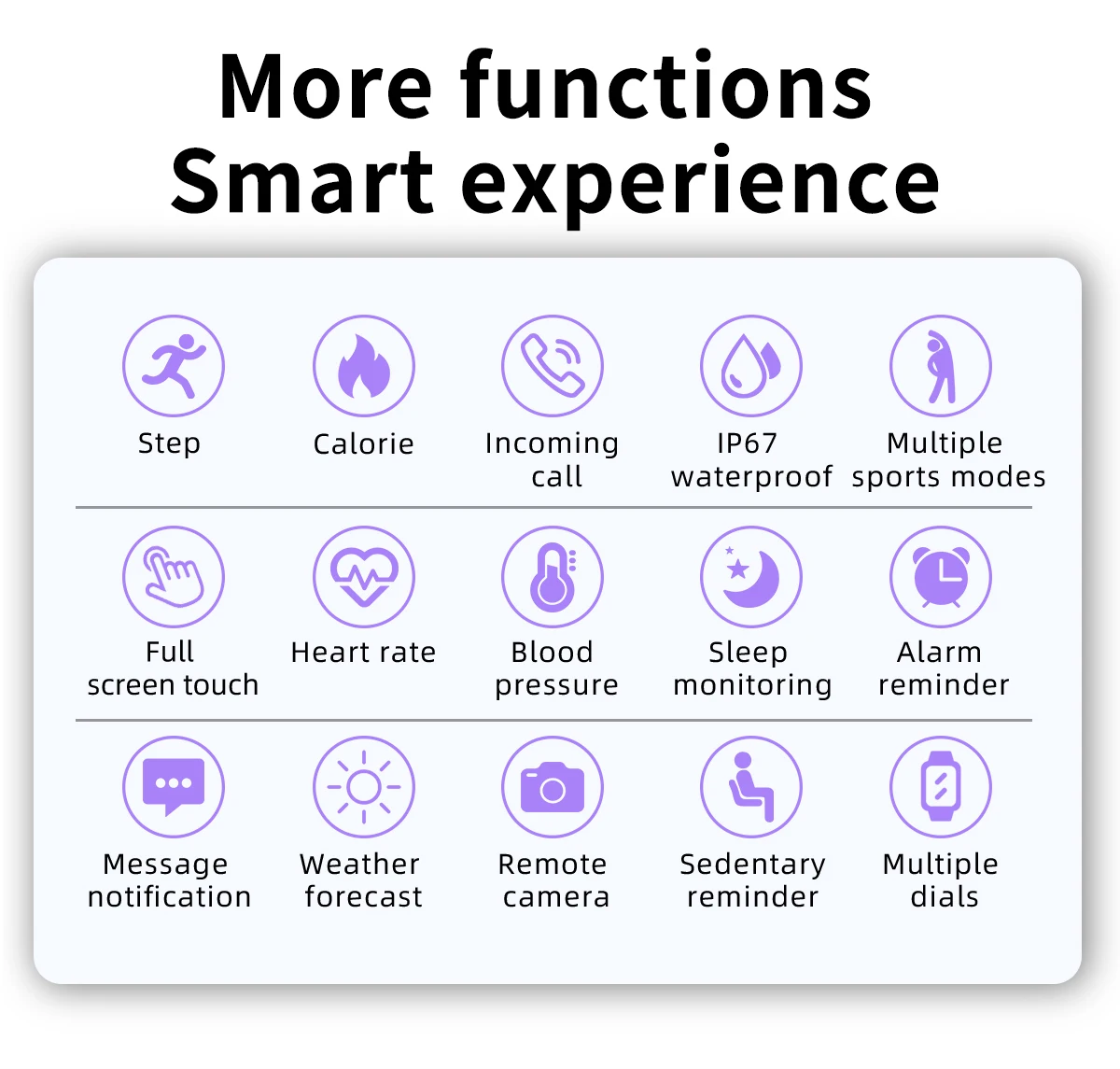 Отклонение входящих звонков, синхронизация уведомлений (входящие звонки, сообщения, социальные сети и т. Д.), будильник, пульт дистанционного управления камерой, поднимите запястье, чтобы разбудить часы, секундомер, найти мой телефон, погоду, несколько циферблатов часов (Поддержка таможенных часов).